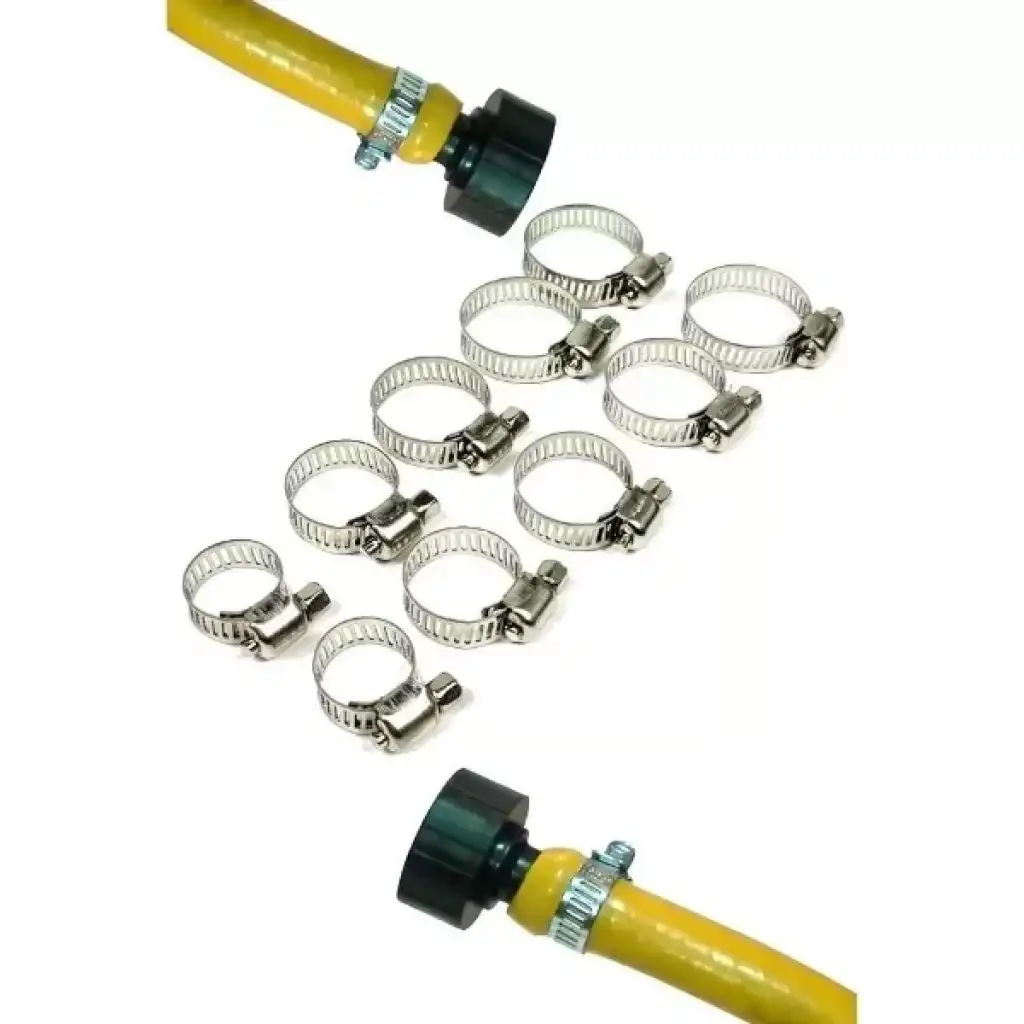 10 PARÇA HORTUM KELEPÇESİ SETİÜrün Özellikleri10 parça hortum kelepçesi seti, farklı çaplara sahip hortumların boru uçlarına sıkıca sabitlenmesi için kullanılır. Su, hava veya yağ hatlarında sıklıkla tercih edilen bu set, çeşitli boyutlardaki hortumlara uyum sağlar. Setin içinde 10 adet kelepçe yer alır, 2 adet 8–18 mm, 2 adet 11–20 mm, 2 adet 13–23 mm, 2 adet 14–27 mm, 2 adet 18–25 mm ve her biri yüksek basınç altında güvenli bağlantılar sağlar. Galvaniz kaplı çelik veya paslanmaz çelikten üretilen hortum kelepçeleri, uzun ömürlü ve paslanmaya karşı dayanıklıdır. Kullanımı oldukça kolay olup, tornavida ile sıkılıp gevşetilebilir.Paket İçeriği1 adet 10 Parça Hortum Kelepçesi Seti