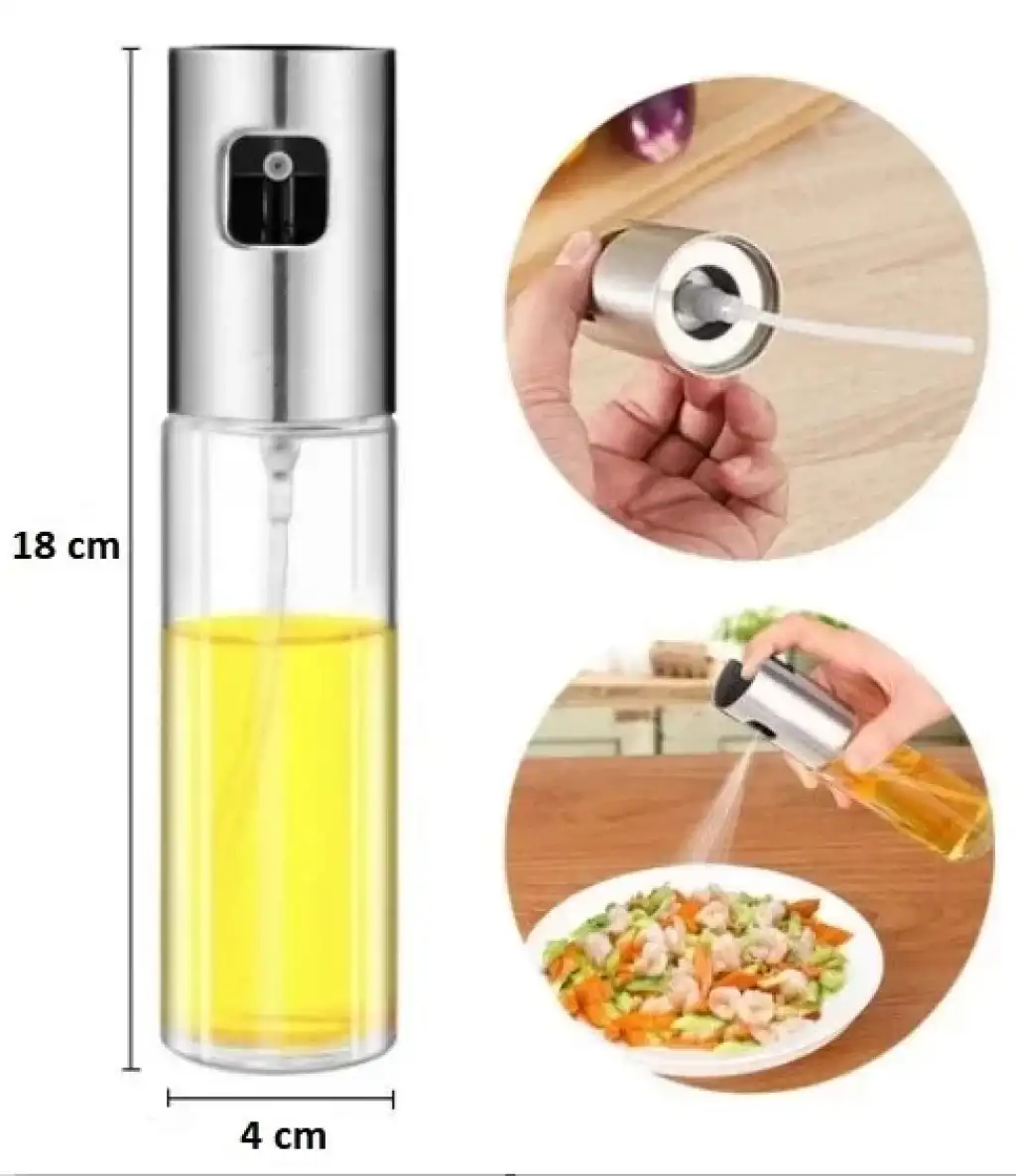 100 ml Çok Amaçlı Spreyli Cam ŞişeÜrün Özellikleri1. Zeytinyağı, soya sosu, sirke ve diğer sıvı çeşnileri için kullanılabilecek Spreyli Cam Şişe malzemesidir.2. Az miktarda sprey, etkili bir şekilde sprey miktarını kontrol edebilir, evde pişirmenin iyi bir yardımcısıdır.3. Cam doku korozyon olmadan sıvıların her türlü tutabilir. Şişe gövdesi şeffaftır ve sıvıyı takip edebilirsiniz.4. Pişirme, barbekü, salata vb.için kullanılabilir.Ürün malzemesi: Cam gövde + ABS kapKapasite: 100 mlÇap: 4 cm Yükseklik: 18 cmBaşlık Renk: GümüşPaket İçeriği1 Adet 100 ml Çok Amaçlı Spreyli Cam Şişe