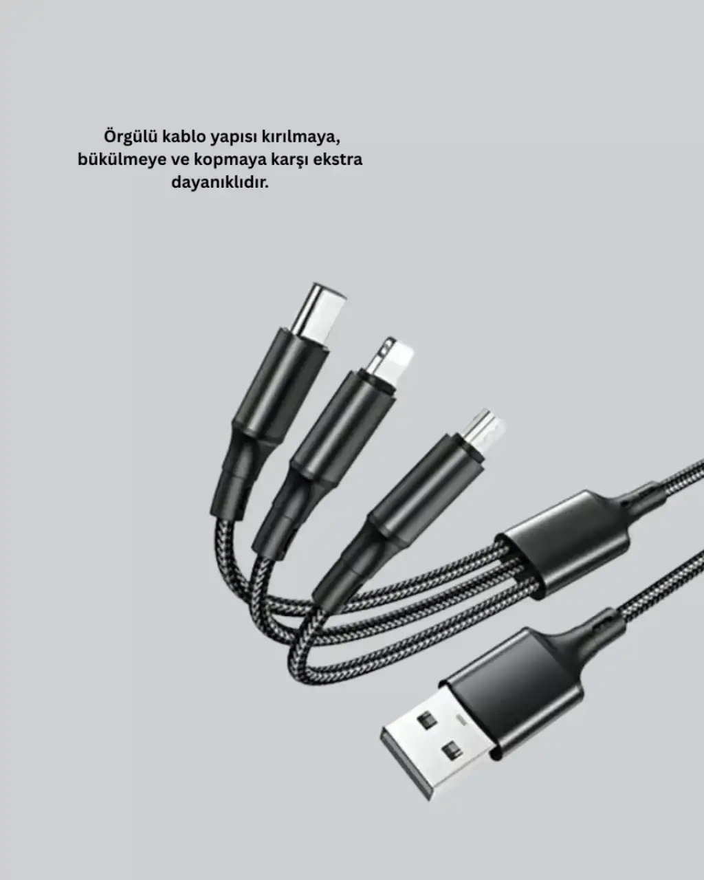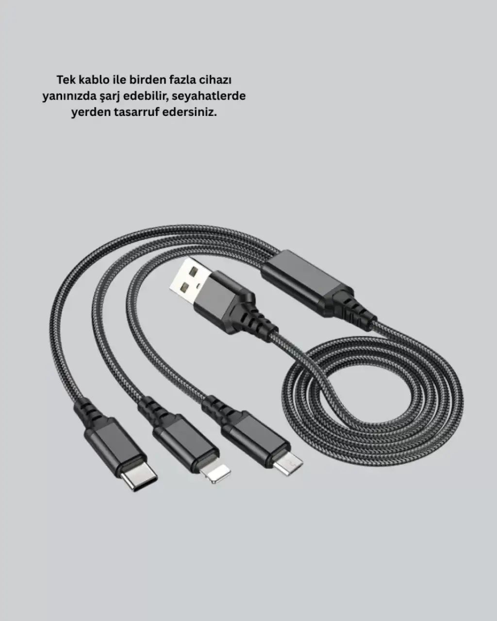 Bu 3’ü 1 arada şarj kablosu yalnızca telefonlar için değil, aynı zamanda tabletler, powerbank’ler, kablosuz kulaklıklar ve Type-C uyumlu diğer elektronik cihazlar için de kullanılabilir. Aynı anda birden fazla cihazı şarj edebilmesi, kalabalık ortamlarda büyük avantaj sağlar. Özellikle aileler, ofis çalışanları ve çoklu cihaz kullanıcıları için mükemmel bir çözümdür. Güvenli, hızlı ve dayanıklı yapısı ile uzun süreli kullanım için idealdir.