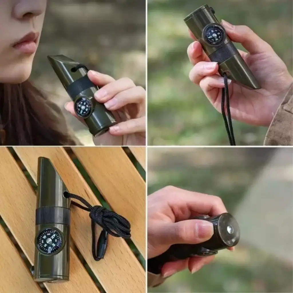 7’Sİ 1 ARADA ACİL DURUM DÜDÜĞÜÜrün Özellikleri7’si 1 arada acil durum düdüğü, doğa yürüyüşleri, kamp, avcılık ve acil durum senaryoları için çok fonksiyonlu ve pratik bir yardımcı olarak tasarlanmıştır. Entegre el feneri düşük ışık koşullarında ve gece yolculuklarında aydınlatma sağlarken, dahili termometre bulunduğunuz ortamın sıcaklığını anlık olarak takip etmenize yardımcı olur. Hassas pusulası yön bulmayı kolaylaştırarak kaybolma riskini azaltır. Büyüteç özelliği küçük detayları net şekilde görmenizi sağlarken, gövde içinde yer alan depolama bölmesi kibrit, iğne veya küçük acil durum malzemeleri için saklama alanı sunar. Güçlü düdük bölümü acil durumlarda yüksek sesle sinyal vererek çevredeki dikkatleri üzerinize çeker. Kompakt, hafif ve dayanıklı yapısı sayesinde çantada, boyunda veya cebinizde rahatlıkla taşınabilir. Kamp, trekking, dağcılık, izcilik ve günlük outdoor aktivitelerinde güvenlik ve pratikliği bir arada sunar.Paket İçeriği1 adet 7’si 1 arada acil durum düdüğü