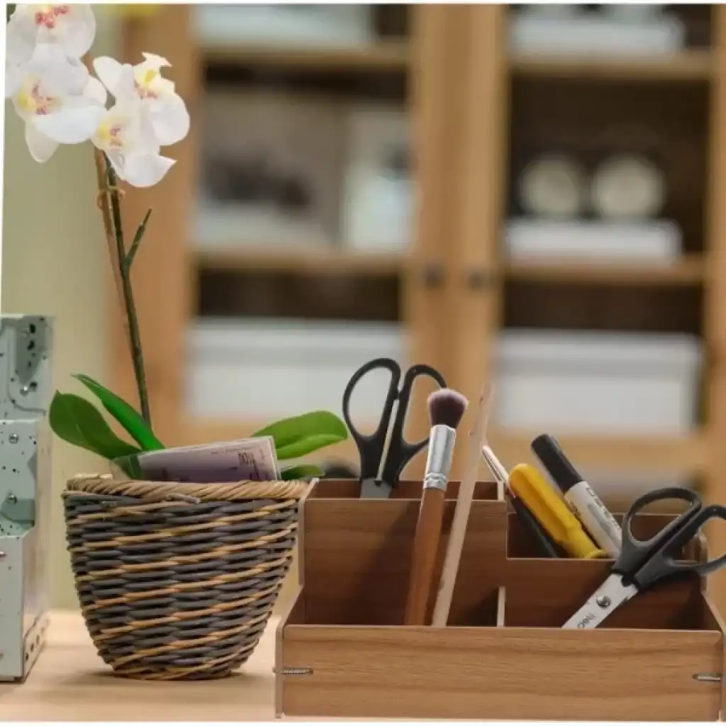 AHŞAP MASA ÜSTÜ DÜZENLEYİCİ KUTUÜrün ÖzellikleriAhşap masa üstü düzenleyici kutu, çalışma alanınızı düzenli ve şık hale getirmek için mükemmel bir çözümdür. Doğal ahşap malzemeden üretilmiş olup sağlam ve dayanıklı bir yapıya sahiptir. Kalem, makas, fırça, cetvel ve diğer ofis ya da makyaj malzemelerinizi düzenli bir şekilde saklamanıza yardımcı olur. Bölmeli yapısı sayesinde farklı eşyalarınızı kategorilere ayırarak kullanabilirsiniz. Şık ve fonksiyonel tasarımı sayesinde ofis masalarında, çalışma odalarında, mutfakta veya makyaj malzemeleri düzenleyicisi olarak rahatlıkla kullanılabilir. Ürün demonte olarak gönderilmektedir ve vidalar ile kolayca monte edilebilir. Hafif ve taşınabilir yapısı sayesinde istenilen her yere kolayca yerleştirilebilir.Paket İçeriği1 adet ahşap masa üstü düzenleyici kutu