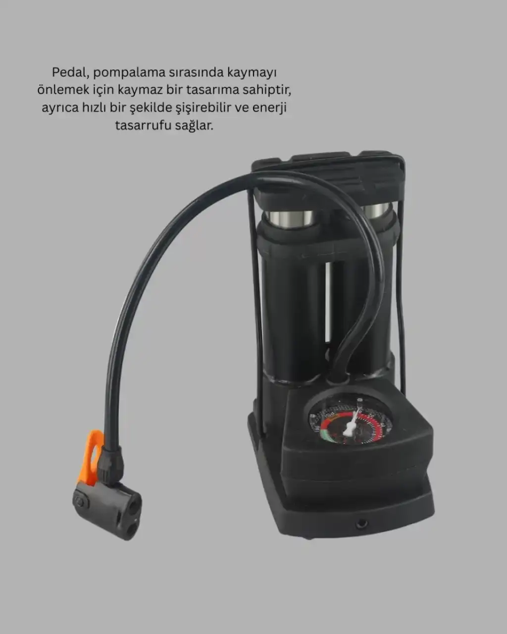 Ayaklı bisiklet ve lastik pompası, hem bireysel hem aile kullanımı için ideal bir çözümdür. Dayanıklı yapısı ve pratik tasarımı sayesinde uzun ömürlü kullanım sunar.Bisiklet, motosiklet, araba lastikleri, spor topları, havuz ürünleri ve şişme oyuncaklar için uygundur. Soğuk havalarda bile performansını koruyan hortum yapısı ile dört mevsim kullanıma uygundur.El pompalarına göre daha hızlı, daha az efor gerektiren bu ürün, evde, garajda, kamp alanlarında ve yolculuklarda vazgeçilmez bir yardımcıdır.