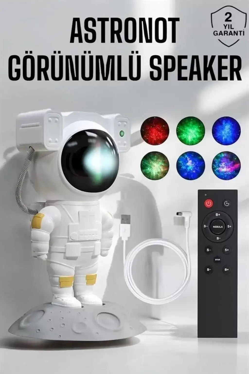 Astronot Projeksiyon Lambası ile evinizin atmosferini değiştiren eşsiz bir deneyim yaşayın. Bluetooth bağlantı özelliği sayesinde telefonunuzla kolayca eşleşir ve sevdiğiniz müzikleri dinleyebilirsiniz. Ayrıca cihazın içinde, huzur veren kuş cıvıltıları, dalga sesleri, şömine ateşi ve uyku müziği gibi sesler de bulunmaktadır. Nebula, yıldız ve ay yansıtma yetenekleriyle odanızı büyüleyici bir gece manzarasına dönüştürür. Ürünün ana malzemesi dayanıklı ABS, PC, PVC ve TPE'den oluşurken, şık ve kompakt tasarımıyla hem dekorasyon hem de fonksiyonellik sunar.Projeksiyon açısını isteğinize göre ayarlayabilir, farklı nebula efektleriyle ambiyansı kişiselleştirebilirsiniz. Nebula ve yıldızların parlaklığı ile hızını kolayca kontrol edebilir, bu ikisini ayrı ayrı veya birlikte kullanabilirsiniz. İki zamanlama modu (45 dakika ve 90 dakika) ile cihazı rahatlıkla uykuya geçiş sürecinizde kullanabilirsiniz. USB güç kaynağıyla çalışan bu lamba, uzun süreli kullanım için enerji tasarruflu bir çözüm sunar. Ürün paketi; bir astronot projeksiyon lambası, bir taban, USB güç kablosu, İngilizce kullanım kılavuzu ve uzaktan kumanda (piller hariç) içermektedir.