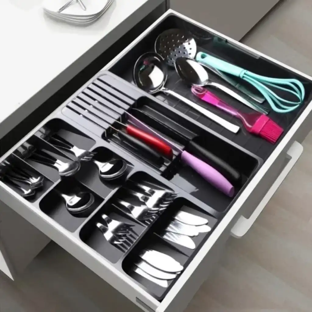 AYARLANABİLİR KAŞIKLIKÜrün ÖzellikleriAyarlanabilir Kaşıklık, mutfak çekmecelerinizi çok daha verimli ve düzenli kullanmanız için geliştirilmiş fonksiyonel bir çözümdür. Ürünün en büyük avantajı olan genişleyebilir sürgülü yapısı, farklı çekmece ölçülerine tam uyum sağlayarak boş alan kalmasını engeller. Şık siyah mat yüzeyi ve modern tasarımıyla mutfak dekorasyonunuza estetik bir dokunuş katar. 30x40x6,3 cm boyutlarındaki baz formu, yanlara doğru açıldığında servis gereçleri, bıçaklar ve büyük mutfak aletleri için ekstra bölmeler oluşturur. Toplamda çok bölmeli organizatör yapısı sayesinde çatal, kaşık, bıçak ve küçük mutfak aksesuarlarınızı kategorize ederek aradığınız her şeye anında ulaşmanızı sağlar. Dayanıklı ve sağlığa uygun plastik materyalden üretilen bu çekmece içi düzenleyici, darbelere karşı dirençli yapısıyla uzun ömürlü kullanım sunar. Kolayca yıkanabilir ve temizlenebilir özelliğiyle hijyenik bir mutfak düzeni sağlayan bu ayarlanabilir kaşıklık, mutfaktaki karmaşayı sonlandırarak zaman kazanmanıza yardımcı olur.Ürün Teknik ÖzellikleriÖzellikAçıklamaÜrün AdıAyarlanabilir KaşıklıkBoyutlar30 x 40 x 6,3 cm (Kapalı Halde)RenkSiyahTasarımGenişleyebilir Sürgülü Sistem - Çok BölmeliMalzemeYüksek Kaliteli PlastikKullanım AlanıMutfak Çekmecesi, Kaşık ve Gereç DüzenlemeÖzellikKolay Temizlenebilir, Ayarlanabilir GenişlikPaket İçeriği1 Adet Ayarlanabilir Kaşıklık