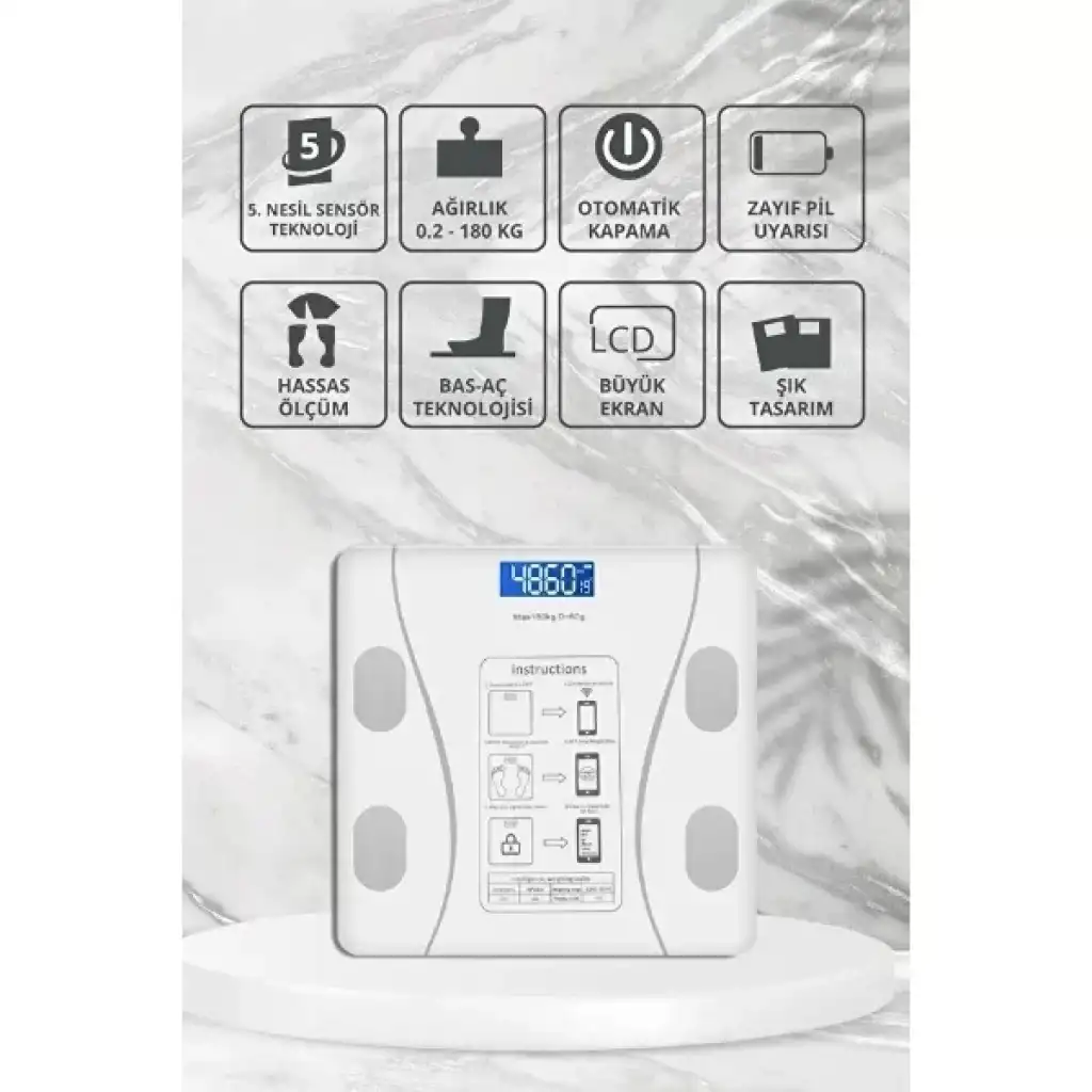 BEYAZ RENK BLUETOOTH ÖZELLİKLİ AKILLI TARTIÜrün ÖzellikleriModern yaşamın vazgeçilmez sağlık yardımcısı olan Beyaz Renk Bluetooth Özellikli Akıllı Tartı, yalnızca kilonuzu değil, aynı zamanda vücut kompozisyonunuzu da detaylı şekilde analiz eder. Gelişmiş sensör teknolojisiyle donatılan bu akıllı tartı, vücut yağı, su oranı, kas kütlesi, kemik kütlesi, protein oranı, visseral yağ, BMI (Vücut Kitle İndeksi) ve BMR (Bazal Metabolizma Hızı) gibi verileri yüksek hassasiyetle ölçer.Bluetooth bağlantısı sayesinde akıllı telefon uygulamasıyla kolayca eşleşir ve ölçüm sonuçlarını anlık olarak kaydeder. Böylece zaman içerisindeki vücut değişimlerinizi takip etmenize imkân tanır. LCD ekranı, ölçüm sonuçlarını net bir şekilde gösterirken, otomatik kapanma özelliği pil ömrünü uzatır ve enerji tasarrufu sağlar. Maksimum 180 kg kapasiteye sahip dayanıklı yapısı, uzun ömürlü kullanım sunar.Şık, sade ve modern tasarımı ile her banyo, spor salonu ya da sağlık merkezine estetik bir dokunuş katar. Hem günlük kullanım hem de profesyonel fitness takibi için mükemmel bir yardımcıdır.Paket İçeriği1 adet Beyaz Renk Bluetooth Özellikli Akıllı Tartı