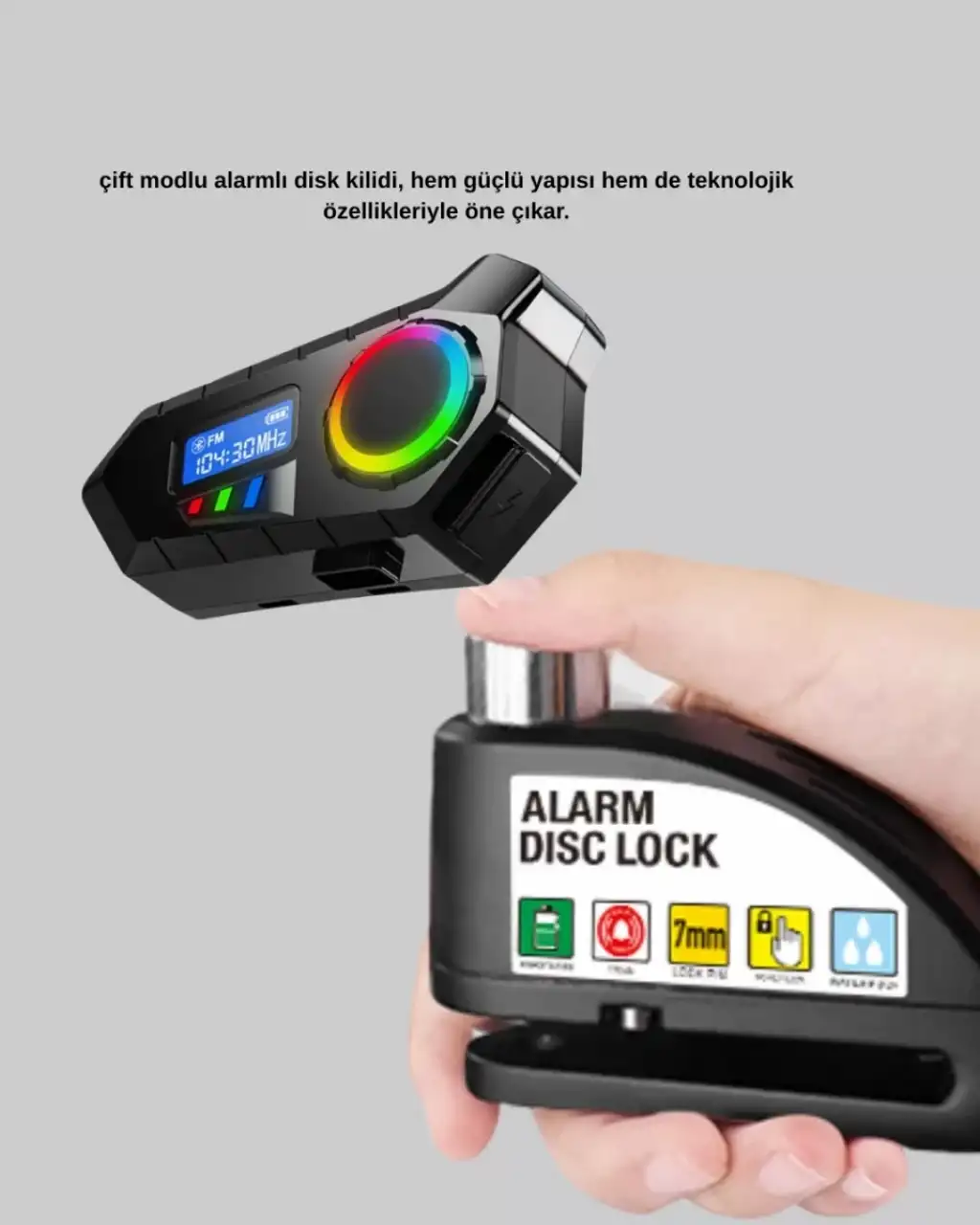 Hem teknolojik hem de koruyucu özellikleri bir araya getiren bu set, aktif yaşam tarzına sahip kullanıcılar için mükemmel bir tercihtir. Bluetooth 5.4 teknolojisi ile donatılmış hoparlör, kesintisiz bağlantı ve yüksek kaliteli ses performansı sunar. Uzun pil ömrü sayesinde gün boyu kullanım imkanı sağlar, hızlı şarj özelliği ile zamandan tasarruf ettirir.Disk kilidi ise sağlam yapısı ve güçlü alarm sistemiyle motosiklet, bisiklet ve scooter kullanıcıları için profesyonel güvenlik sağlar. Zorlu hava koşullarına dayanıklı çelik gövdesi sayesinde dış mekan kullanımına uygundur. Eğlence ve güvenliği tek bir pakette sunan bu set, hem bireysel kullanım hem de hediye alternatifi olarak öne çıkar.