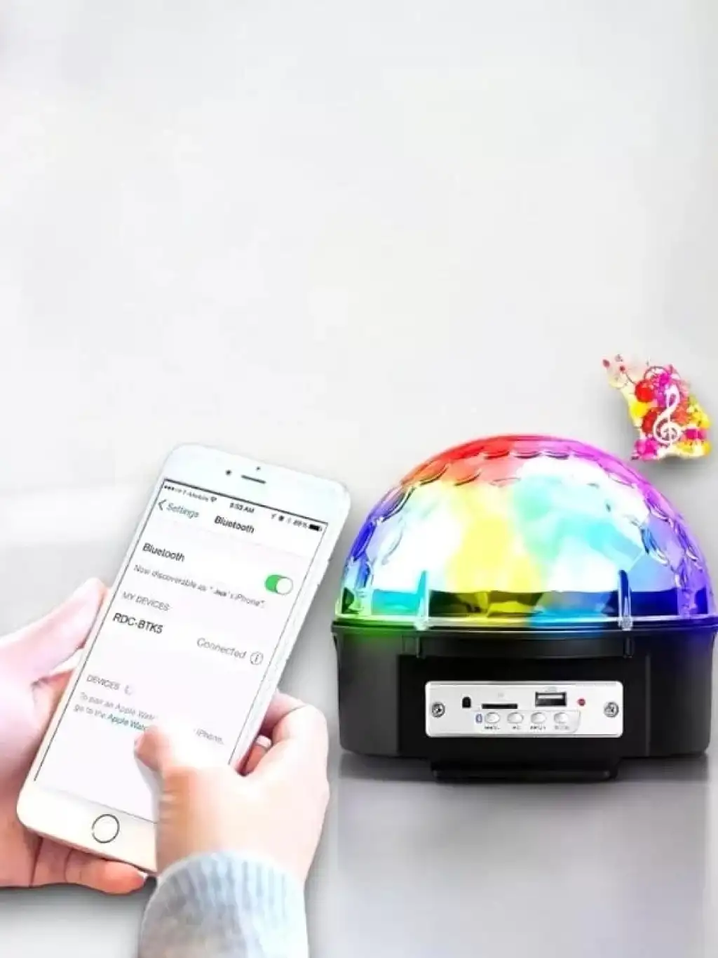 Sese Duyarlı Disko TopuSD Kart ve USB Girişli LED Disko Işıklı Speaker Hoparlör (Kumandalı)Müzik dinlemek hiç bu kadar eğlenceli olmamıştı.Odanızda müzik dinlerken ortama harika bir görsel şölen yaşatmaya ne dersiniz ?Partilerinizde ve kutlamalarınızda SD Kart ve USB Girişli LED Işıklı Kristal Yarım Küre var ise başka bir şeye ihtiyacıınz yoktur.SD Kart ve USB Girişli LED Işıklı Kristal Yarım Küre ile kırmızı, mavi ve yeşil olmak üzere 3 farklı renk kombinasyonu müzik ritmine ayak uyduruyor.SD kart veya USB Bellek desteğiyle istediğiniz şarkıyı SD Kart yada USB Belleğinize yükleyin ve kumanda sayesinde yada üzerinde yer alan tuşları sayesinde müziği başlatın.Müziğin ritmine göre içerisinde yer alan led lambalar hareketli olarak yanıp sönmeye başlayacaktır.Ürünü prize ilk taktığınızda sadece dönerek led ışık saçacaktır.Dahili hoparlör, iyi bir ses kalitesi Bulunduğu ortamı aydınlatan güçlü LED ışık Tak çalıştır sistemiyle prize taktığınız andan itibaren ürünü kolaylıkla çalıştırabilirsiniz.Uzaktan kumanda ile ses kontrolü ve müzikler arası geçiş rahatlıkla sağlanabilir.1,5 Kg ağırlığındadır.Paket içerisinden çıkan Hediye USB Bellek 128 MB hafızaya sahiptir.USB Bellek içerisinde toplam 17 adet deneme amaçlı müzik yüklüdür.İsterseniz USB Belleği bilgisayarınıza takıp içindeki müzikleri silip,yükleyebilirsiniz.
