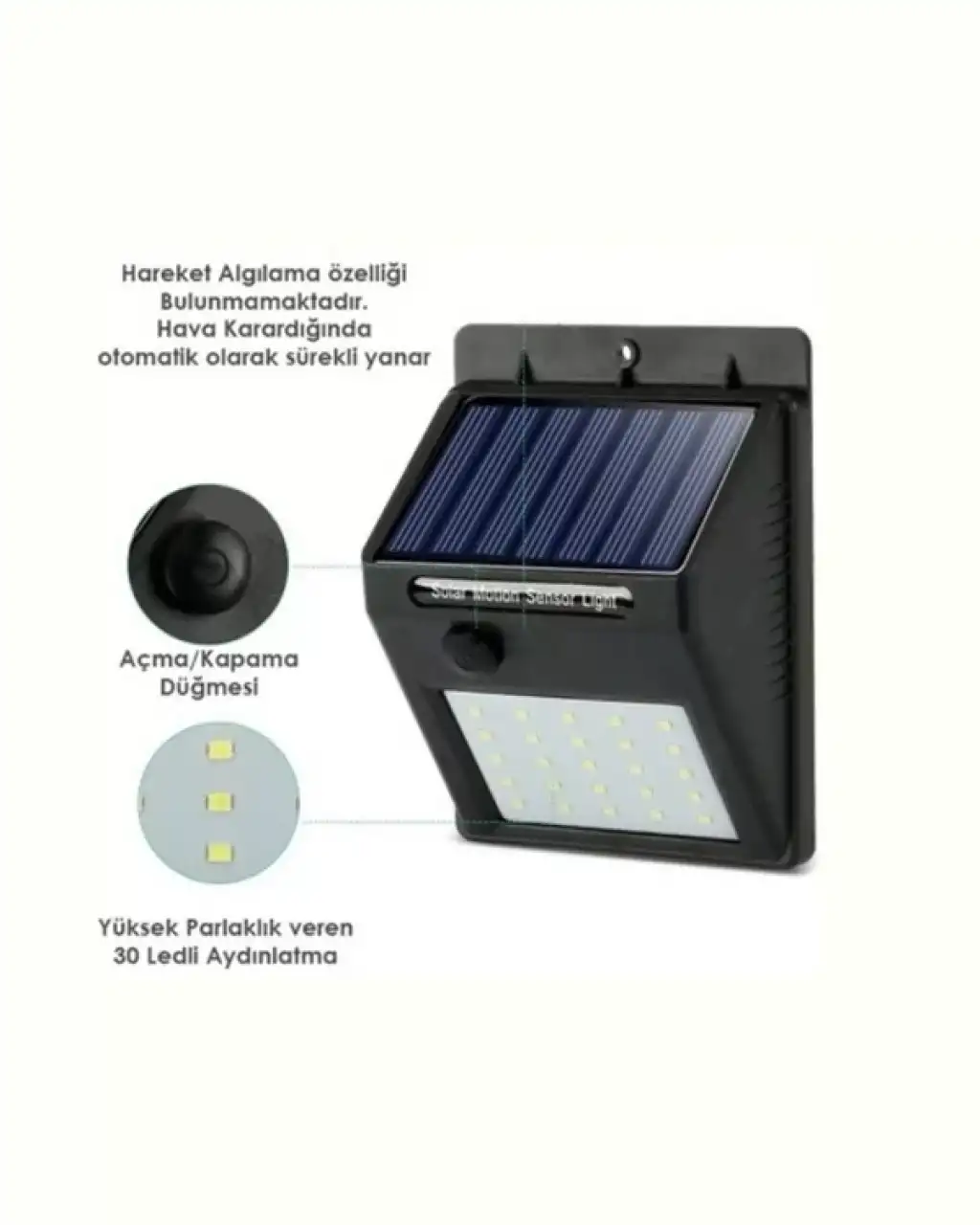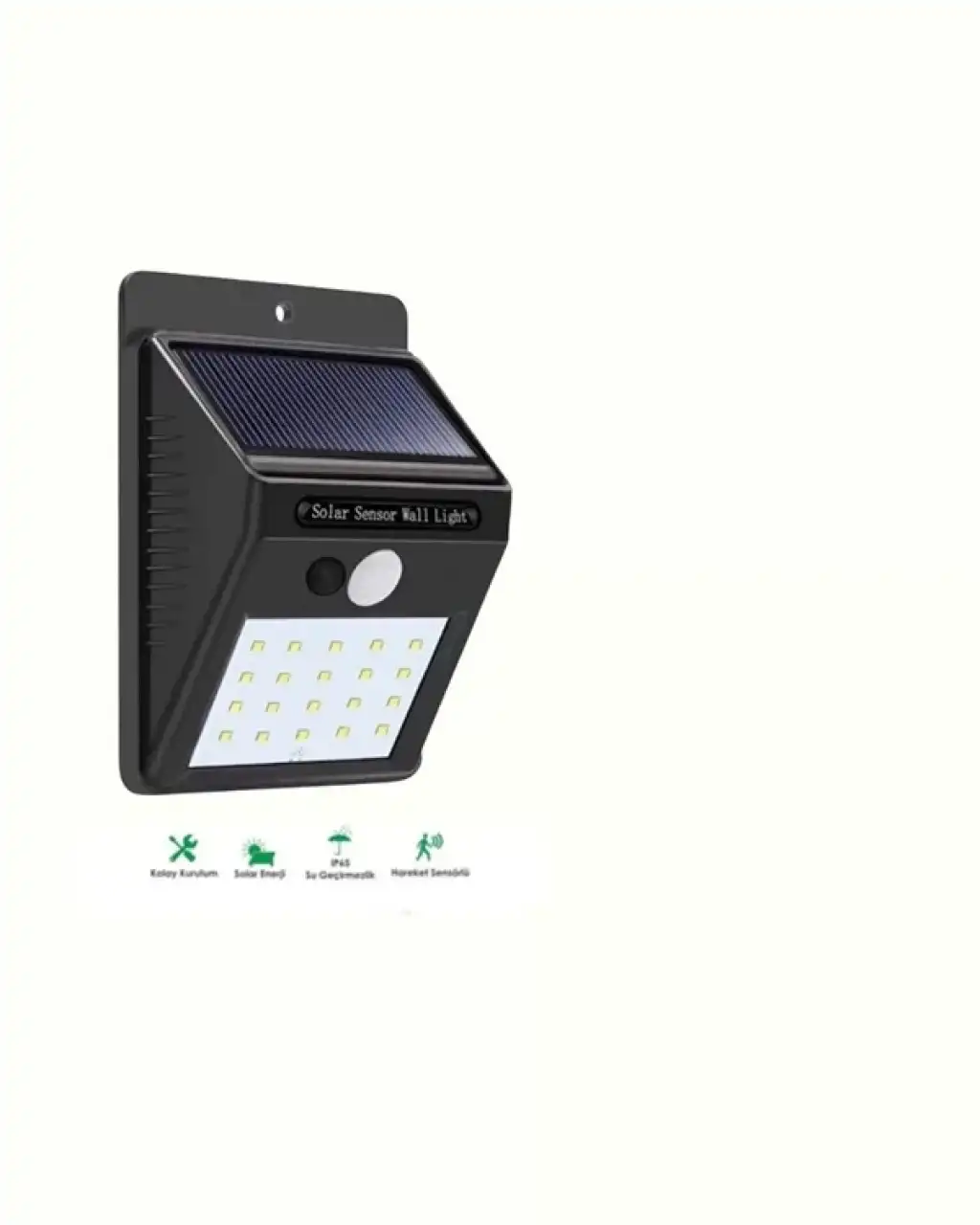 Karanlık alanlarda güvenliği ve görünürlüğü artırmak için hem çevre dostu hem de maliyetsiz bir çözüm arıyorsanız, doğru yerdesiniz. Hareket Sensörlü Solar Enerjili 20 LED Duvar Lambası, enerjisini tamamen güneşten alan, kablo gerektirmeyen, düşük maliyetli ve yüksek performanslı bir aydınlatma cihazıdır. Bu ürün sayesinde evinizin dış cephesinden bahçenize, garaj girişinden merdiven basamaklarına kadar tüm alanlar gece boyunca güvenli, aydınlık ve şık bir şekilde görünür olur.Solar Enerji ile Otomatik Şarj – Elektrik Faturasına SonLamba, üzerindeki yüksek verimli güneş paneli sayesinde gün boyunca güneş ışığını emerek 1200 mAh lityum bataryasını otomatik olarak şarj eder. Bu sayede geceleri enerjiye ihtiyaç duyduğunda hiçbir ekstra kaynağa gerek kalmadan çalışabilir. Tam şarj olduğunda 8 saate kadar kesintisiz ışık sağlar. Elektrik bağlantısına ihtiyaç duymadan, tamamen doğa dostu ve ücretsiz bir enerji kaynağıyla çalışan bu lamba, elektrik faturalarınızı düşürürken karbon ayak izinizi de azaltır.Gelişmiş PIR Hareket Sensörü ile Akıllı AydınlatmaLambanın merkezinde yer alan PIR (Pasif İnfrared) sensör, hareketleri 120° geniş açıyla ve 3-4 metreye kadar algılayabilir. Akşamları veya geceleri biri yaklaştığında otomatik olarak yanar, 10 ila 25 saniye boyunca ışık yayar ve ardından hareket algılanmazsa otomatik olarak kapanır. Bu özellik hem enerji tasarrufu sağlar hem de beklenmeyen misafirlere karşı caydırıcı güvenlik sunar.4 Farklı Aydınlatma Modu ile Kullanım EsnekliğiKlasik lambalardan farklı olarak, bu ürün çok işlevli aydınlatma modlarına sahiptir: Kapalı Şarj Modu – Gündüzleri şarj olur, gece yanmaz. Hareketle Aktifleşen Parlak Işık – Sadece hareket algılandığında yüksek parlaklıkta yanar. Kısık Işık + Hareketle Parlak Işık – Hareketsizken kısık, hareket algılandığında tam parlaklıkta çalışır. Sürekli Kısık Işık Modu – Gece boyunca kısık ışıkla sürekli yanar.Bu modlar sayesinde ürünü ister güvenlik ışığı, ister dekoratif bahçe lambası, ister gece boyunca loş aydınlatma olarak kullanabilirsiniz.Su Geçirmezlik ve Dış Mekan Dayanıklılığı (IP65)IP65 su geçirmezlik sertifikası, ürünün yağmur, kar, rüzgar ve aşırı sıcaklıklara karşı dayanıklı olduğunu garanti eder. Sağlam ve sert plastikten üretilmiş gövdesi, çizilmelere ve darbelere karşı dayanıklıdır. Yıllarca bozulmadan, sararmadan, çatlamadan kullanılabilir. Bahçe, veranda, balkon, garaj kapısı, yürüyüş yolları, çitler ve hatta çiftliklerde bile sorunsuzca görev yapar.Kurulumu Çok Kolay – Kablo Yok, Elektrikçi YokBu ürünün kurulumu için herhangi bir teknik bilgiye ihtiyacınız yok. Paket içeriğindeki vidalar yardımıyla, sadece birkaç dakika içinde duvara veya çite monte edebilirsiniz. Kablo çekmeye ya da prize ulaşmaya çalışmanıza gerek kalmaz. Güneşi gören herhangi bir dış yüzey ürünü monte etmek için yeterlidir. İhtiyacınız olan tek şey, güneş ışığını alabileceği uygun bir yer seçmek.Teknik Özellikler: Pil Kapasitesi: 1200mAh Li-ion batarya Giriş Voltajı: 3.7V LED Gücü: 0.2W x 20 LED Hareket Algılama Açısı: 120° Algılama Mesafesi: 3-4 metre Gecikme Süresi: 10 – 25 saniye Aydınlatma Modları: 4 farklı mod Gövde Malzemesi: Yüksek yoğunluklu sert plastik Renk: Siyah Boyut: Kompakt ve hafif