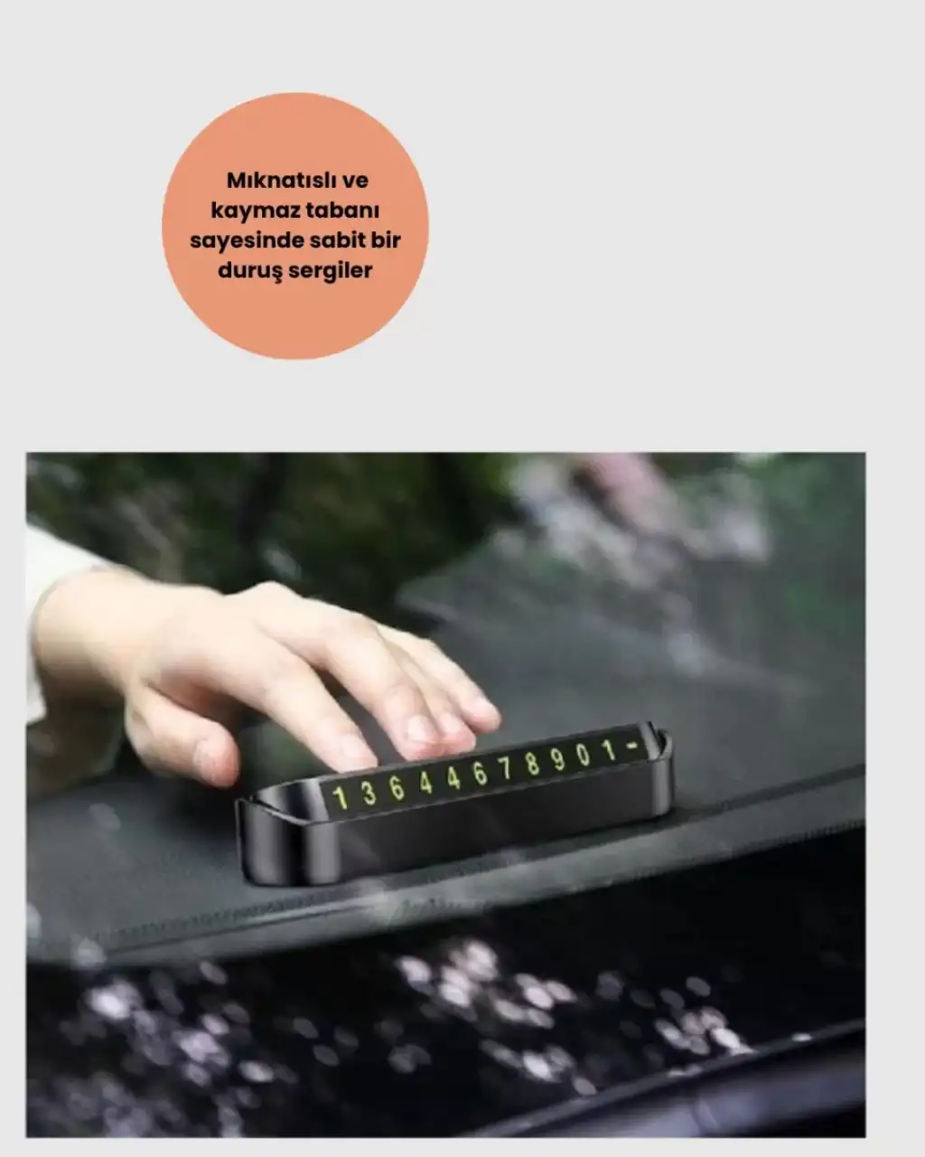 Fosforlu araç içi numara göstergesi, küçük boyutuna rağmen büyük bir işleve sahip. Kısa süreli park anlarında cep telefonu numaranızı görünür hale getirerek başkalarının size ulaşmasını kolaylaştırır. Bu sayede yanlış park gibi durumlarda iletişim kurmak mümkün olur, sorun büyümeden çözülür.Gece kullanımına uygun fosforlu rakamları, ışık gerektirmeden parlayarak görünürlüğünü korur. Loş ışıkta bile okunabilir oluşu sayesinde günün her saati işe yarar.Ürünün en büyük avantajlarından biri, montaj gerektirmemesi. Araç içinde herhangi bir sabitleyiciye gerek kalmadan düz yüzeylere kolayca yerleştirilir. Kaymaz yapısı, hareket halinde bile yerinden oynamaz.Estetik çizgileri ve modern tasarımı ile aracınızın iç görünümünü güzelleştirirken, dayanıklı malzeme kalitesiyle uzun süreli kullanım sunar. Baskılar silinmez, renkler solmaz.Minimal ama etkili bir çözüm arayanlar için ideal bir üründür.