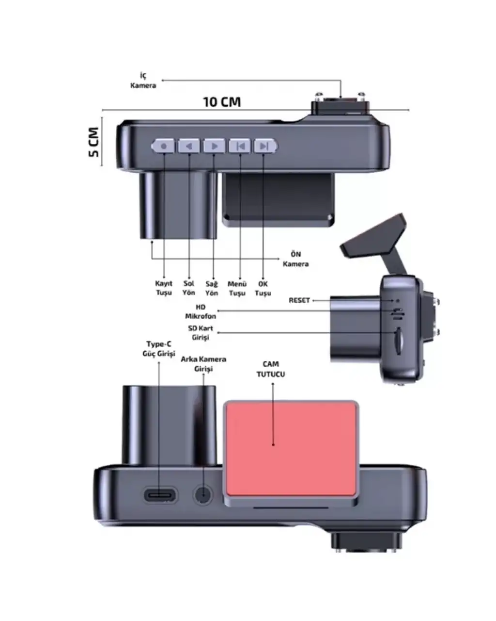 Bu sistem, hem kullanıcıların hem de yolcuların güvenliği için tasarlanmıştır. Ön kamera 1080p çözünürlüğüyle tüm detayları yakalarken; iç kamera çocuklar, yolcular veya kabin içi hareketleri kontrol altında tutar. Arka kamera, geri vites kullanımında otomatik olarak devreye girer ve ekranda park çizgileri gösterir. Ayrıca park halindeyken hareket algılandığında dahili Wi‑Fi bağlantısı üzerinden anlık bildirim alınabilir. G‑sensör kazalar sırasında kayıtları koruma altına alarak olası sigorta veya adli süreçler için güvenilir veri sağlar. Döngüsel kayıt ile ayni kaliteyle uzun süreli kayıt yapılabilir. 32 GB microSD kart dahil paketle birlikte, 128 GB’e kadar yükseltme seçeneği sunulur. Uygulama destekli kontrol, her noktanın net görüntülenmesini sağlar.