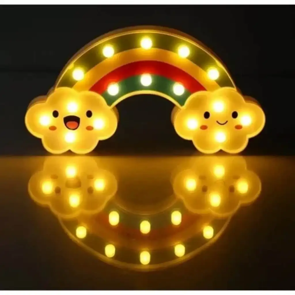 GÜLEN BULUTLU GÖKKUŞAĞI LED GECE LAMBASIÜrün ÖzellikleriGülen Bulutlu Gökkuşağı LED Gece Lambası, çocuk odalarına neşe ve huzur katmak için tasarlanmış dekoratif ve işlevsel bir aydınlatmadır. 30x16 cm boyutundaki bu şirin gece lambası, gökkuşağı formu ve gülen bulut figürleriyle hem sevimli bir aksesuar hem de yumuşak ışığıyla rahatlatıcı bir gece arkadaşıdır.Arkasında bulunan asma yerleri sayesinde dilerseniz duvara monte edebilir, dilerseniz masa üstünde kullanabilirsiniz. Kalem pil ile çalışır ve piller pakete dahil değildir. Gün ışığı rengindeki yumuşak LED ışıkları göz yormaz, loş bir ambiyans oluşturarak çocukların daha huzurlu uyumasına yardımcı olur. Ayrıca enerji tasarruflu yapısıyla uzun süreli kullanım sağlar.Hem çocukların odasında dekoratif bir obje olarak hem de gece lambası ihtiyacını karşılayan bu ürün, şirin tasarımıyla eğlenceli ve güvenli bir ortam oluşturur. Sevdiklerinize hediye edebileceğiniz ideal bir seçenek olarak da öne çıkar.Paket İçeriği1 adet Gülen Bulutlu Gökkuşağı LED Gece Lambası
