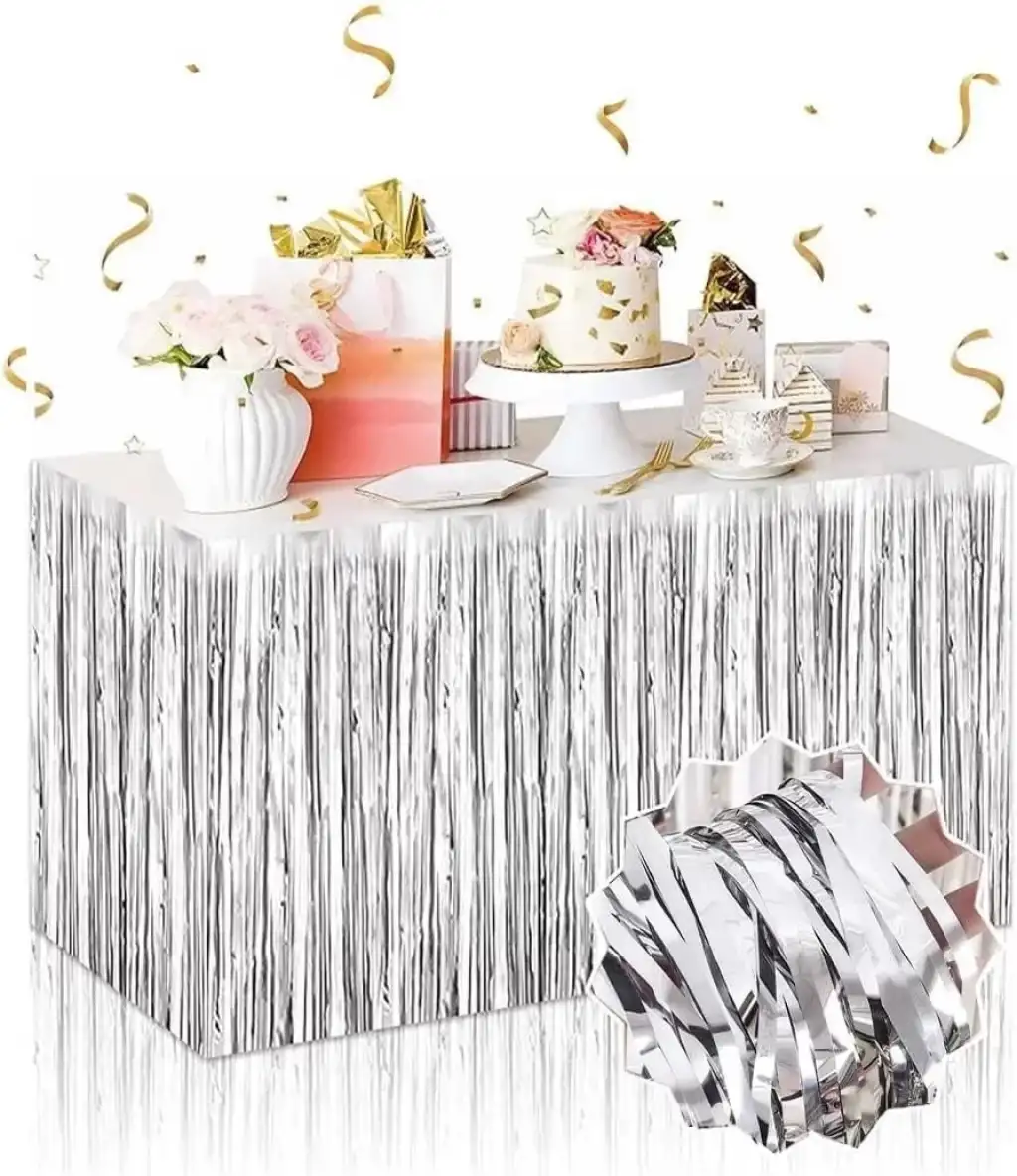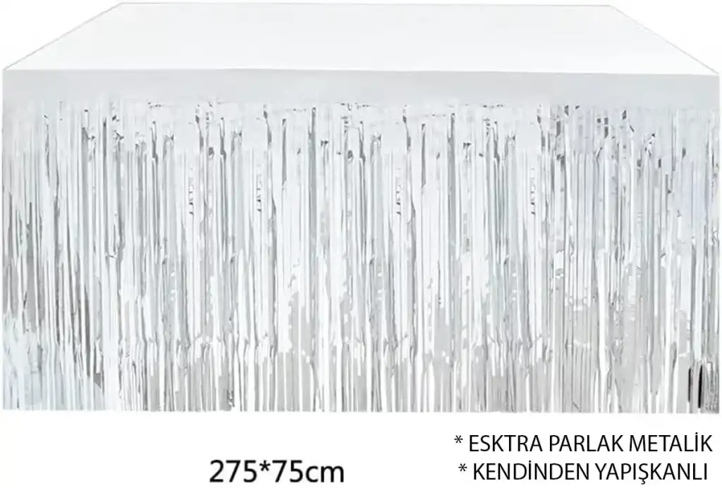 ümüş Metalize Masa Eteği AçıklamaGümüş Metalize Masa Eteği 275x75 cm – Kendinden Yapışkanlı, partilerinize parlak ve modern bir görünüm kazandıran dekoratif masa süslemesidir. Gümüş metalize yüzeyi, özel günlerinize ışıltı ve şıklık katar.Ürün ÖzellikleriKendinden yapışkanlı yapısı sayesinde kolay ve hızlı kurulum sağlar.275 cm uzunluk ve 75 cm yükseklik ölçüleriyle çeşitli masa boyutlarına uygundur.Dayanıklı, hafif ve yırtılmaya karşı dirençli malzemeden üretilmiştir.Gümüş metalize yüzey, partilerinizde modern ve şık bir atmosfer yaratır.Kolay çıkarılabilir ve zarar vermeden tekrar kullanılabilir.Paket İçeriği1 adet Gümüş Metalize Masa Eteği 275x75 cm – Kendinden Yapışkanlı