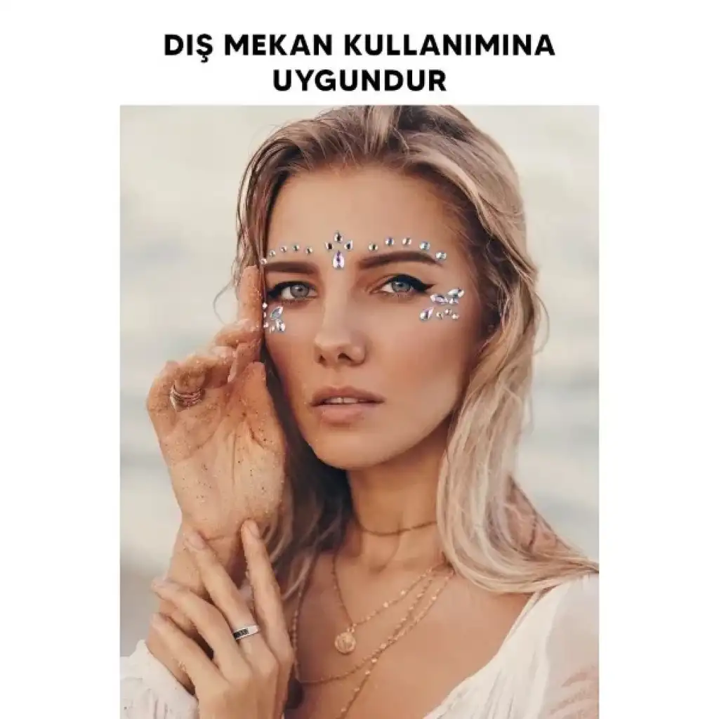 GÜMÜŞ TAŞLI MAKYAJ YÜZ SÜSÜÜrün ÖzellikleriGümüş taşlı makyaj yüz süsü, “Face Jewels” tasarımı ile hazırlanan dekoratif bir makyaj aksesuarıdır. Ürün, göz çevresi ve kaş üstü bölgesine uygun şekilde konumlandırılmış çoklu taş dizilimlerinden oluşur. Parlak yüzeyli gümüş taş detayları ışığı yansıtan bir görünüm sunar ve yüz makyajında dikkat çekici bir etki oluşturur. Simetrik formda hazırlanan taş yerleşimi, her iki göz çevresinde dengeli bir görünüm sağlar. Farklı boyutlardaki taş kombinasyonu sayesinde tek parça halinde bütüncül bir tasarım sunar. Özel gün makyajlarında, festival stilinde veya sahne makyajında kullanılabilecek Face Jewels yüz süsü, makyaja ışıltılı ve belirgin bir dokunuş kazandırır.Ürün Teknik Özellikleri Özellik Açıklama Ürün Adı Gümüş Taşlı Makyaj Yüz Süsü Model Face Jewels Renk Gümüş Tasarım Simetrik taş dizilimi Kullanım Alanı Göz çevresi ve kaş üstü Paket İçeriği1 adet gümüş taşlı makyaj yüz süsü