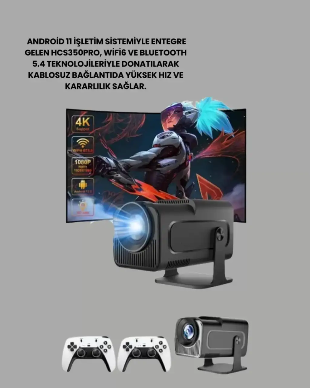 HCS350pro, taşınabilirliği ve performansıyla öne çıkan bir projektördür. Yerel 1080P çözünürlük ve 450 ANSI lümen parlaklık değeri ile film ve oyunlarda net, canlı ve detaylı görüntüler elde edilir. LED ışık teknolojisi sayesinde daha uzun süreli kullanım ve enerji verimliliği sağlanır. Sadece 1.5 kg ağırlığı ile taşıması kolaydır, iç ve dış mekanlarda kullanıma uygundur. Android 11 işletim sistemi sayesinde uygulamalar doğrudan projektöre yüklenebilir. 1 GB RAM ve 8 GB dahili depolama alanı, temel uygulamalar ve medya içerikleri için yeterlidir. WiFi6 ve Bluetooth 5.4 teknolojileri sayesinde hızlı ve kesintisiz bağlantı sunar. iOS ve Android uyumlu cihazlardan kablosuz bağlantı ile içerik paylaşımı yapılabilir. 4500’den fazla retro oyun, harici donanım gerektirmeden direkt oynanabilir. Geniş ekran projeksiyon ve 4K desteği ile izleme ve oyun deneyimi daha gerçekçi hale gelir. Multimedya arayüzü üzerinden Netflix ve YouTube gibi uygulamalara doğrudan ulaşmak mümkündür. Çoklu dil desteği sayesinde farklı kullanıcı profillerine hitap eder. 2 yıl garanti kapsamında teknik destek sağlanır. HCS350pro, ev eğlencesi ve taşınabilirlik arayan kullanıcılar için uygun bir tercihtir.