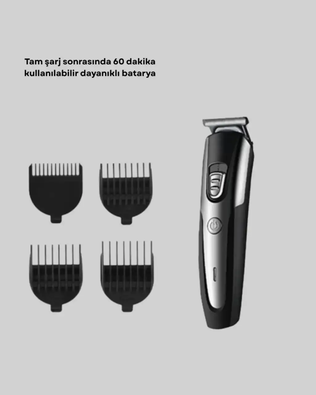 Profesyonel erkek bakım tıraş makinesi, güçlü motoru ve keskin bıçak sistemi sayesinde saç ve sakal bakımında yüksek performans sunar. Saç kesimi, sakal şekillendirme, ense düzeltme ve favori çizgisi belirginleştirme işlemlerinde kusursuz sonuçlar verir.Kablosuz kullanım özelliği hareket özgürlüğü sunar. Tek şarjla 30–60 dakika arası kesintisiz çalışma sağlar. Ergonomik tasarımı elinizde rahat tutuş sağlar ve uzun süreli kullanımlarda bile yormaz.Cihazla birlikte 3, 6, 9 ve 12 mm taraklar bulunur. Bu taraklar farklı uzunluklarda düzenli kesim yapmayı kolaylaştırır. Özellikle ayrıntılı sakal şekillendirme için özel başlıkları bulunur.Islak–kuru kullanım desteği, duş sırasında bile pratik ve hızlı tıraş yapma imkânı sunar. Otomatik kapanma fonksiyonu güvenli kullanım ve enerji tasarrufu sağlar.Bu tıraş makinesi, lazer epilasyon öncesi kılları kısaltmak için de ideal yapıya sahiptir. Cildin daha pürüzsüz hâle gelmesini destekler.Kolay temizlenebilir tasarımı hijyenik kullanım sağlar ve cihazın ömrünü uzatır. Hem profesyoneller hem kişisel kullanıcılar için güçlü, fonksiyonel ve uzun süre performans sunan bir tıraş makinesidir.