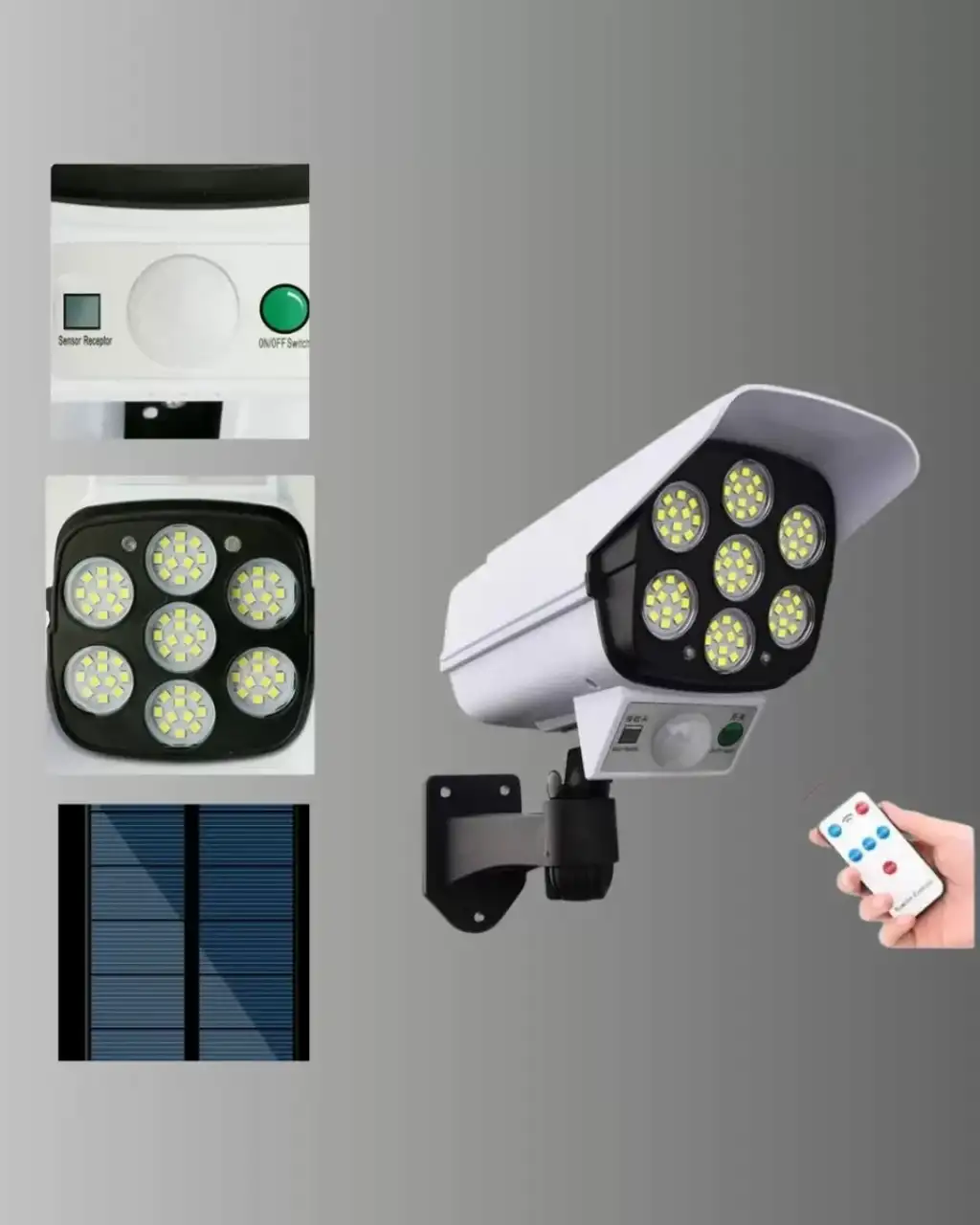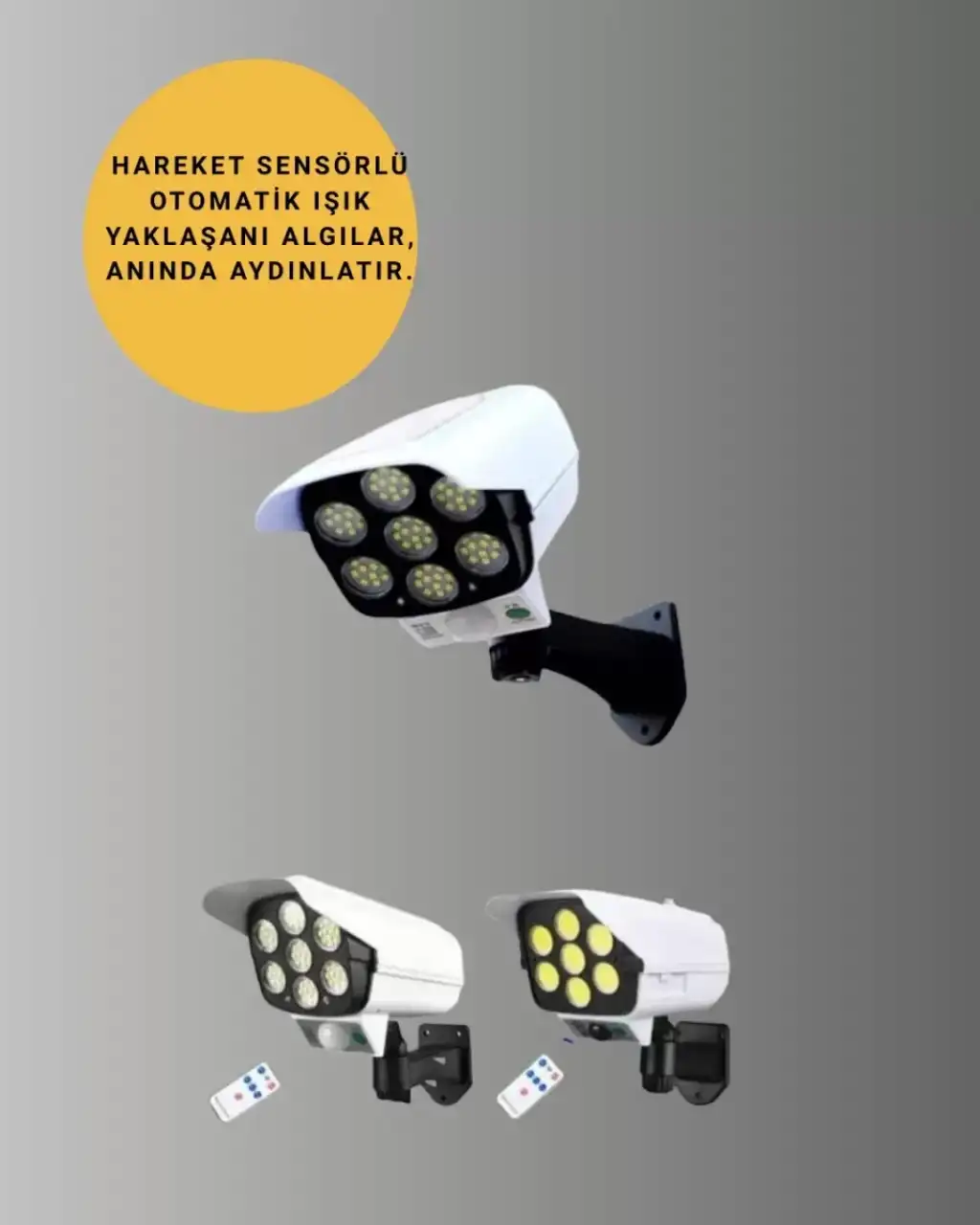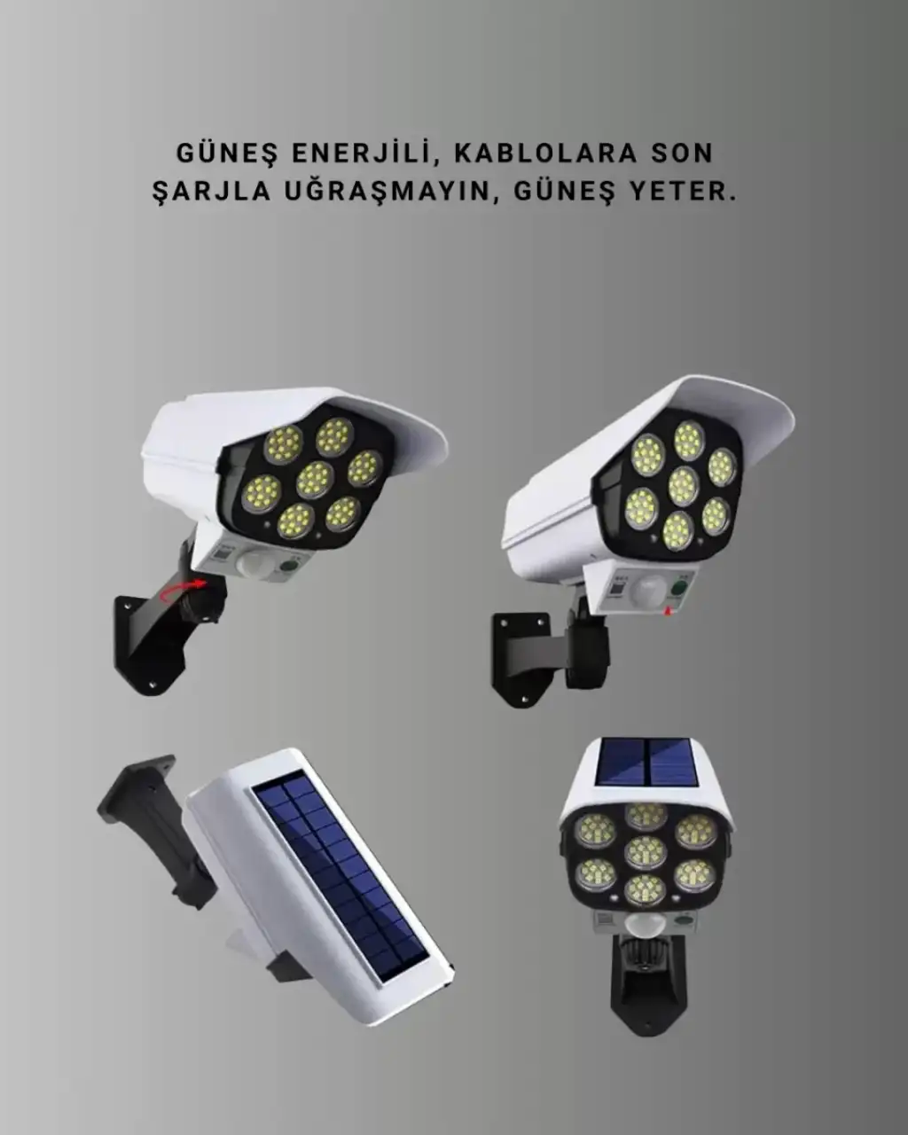 Bu 2’si 1 arada güneş enerjili dış mekân lambası, 77 LED ışık kaynağı ve güvenlik kamerası tasarımıyla hem aydınlatma hem de caydırıcı güvenlik çözümü sunar. Gün boyunca entegre polisilikon güneş paneli (5.5V / 300mA) sayesinde enerjisini güneşten alır, akşamları ise dahili 2400mAh kapasitesindeki çift 18650 lityum pil ile kesintisiz aydınlatma sağlar. 8 ila 10 saate kadar aralıksız çalışabilen güçlü bataryasıyla evinizin çevresinde güvenliği artırır.77 adet yüksek parlaklık sağlayan SMD LED boncuğu ile geniş bir alanı aydınlatabilen bu lamba, özellikle bahçe, garaj, sundurma, giriş kapısı ve yürüyüş yolları için idealdir. Ürün, farklı ihtiyaçlara uygun olarak seçilebilecek 3 farklı akıllı aydınlatma moduna sahiptir: Işık kapalıyken sadece kırmızı ışık yanar, hareket algılandığında güçlü beyaz ışık açılır. Sürekli zayıf ışık açık kalır, hareket algılandığında yüksek parlaklığa geçer. Her zaman açık modda beyaz ışık sabit yanar ve kırmızı uyarı ışığı da çalışır.Dahili PIR hareket sensörü, 120° algılama açısında 5–8 metre mesafeye kadar insan hareketlerini tespit edebilir. Sensör, hareket algılandığında ışığı otomatik olarak yakar ve 20 saniye sonra tekrar kapatır.Sağlam ve hafif yapılı (431g) bu ürün, kaliteli PVC + PC malzemeden üretilmiştir. IP65 su geçirmezlik derecesi sayesinde yağmur, kar ve toz gibi zorlu dış hava koşullarında bile performansından ödün vermez. Lambanın ve güneş panelinin yönü kolayca ayarlanabilir, bu da optimum güneş alma ve ışık yönlendirme açısını kullanıcıya bırakır.Kurulumu oldukça kolaydır. Kablolama gerekmeden, sadece vida ile sabitleyerek kullanıma hazır hâle gelir. Şehir elektriğine ihtiyaç duymadan, çevre dostu bir şekilde enerji üretir ve kullanır.Ürün Teknik Özellikleri: Güneş Paneli: 5.5V / 300mA polisilikon Pil: 2 x 18650 lityum (3.7V 1200mAh) – Toplam 2400mAh Işık Kaynağı: 77 SMD LED Malzeme: PVC + PC Renk Sıcaklığı: Beyaz Algılama Mesafesi: 5–8 metre Algılama Açısı: 120° Aydınlatma Süresi: 8–10 saat İndüksiyon Süresi: 20 saniye Ağırlık: 431g Renk: Beyaz gövde, beyaz ışık