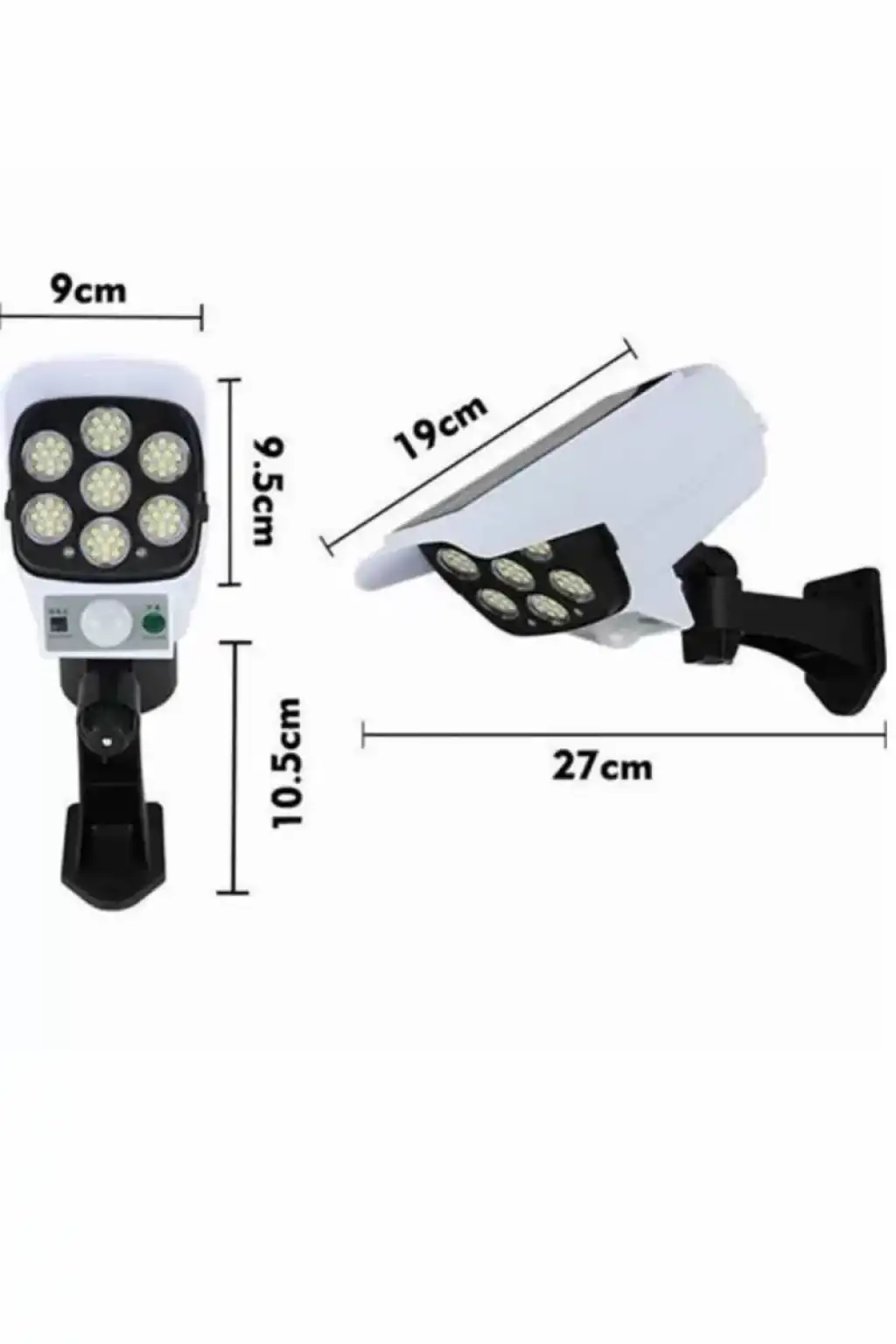 Çift Fonksiyonlu TasarımSahte güvenlik kamerası görünümü sayesinde caydırıcı bir etki yaratırken, aynı zamanda güçlü LED aydınlatmasıyla bahçenizi veya dış mekanınızı aydınlatır. Hem güvenlik hem de dekoratif amaçlı kullanım için idealdir.Güneş Enerjisi ve Uzun Süreli Pil Kullanımı2400mAh yüksek kapasiteli pili sayesinde düşük ışık modunda 40 saate kadar kesintisiz çalışabilir. Ek olarak, güneş paneli sayesinde güneş ışığını emerek enerji tasarrufu sağlar, çevre dostu bir kullanım sunar.Akıllı Hareket Sensörü ile Otomatik AydınlatmaDahili PIR hareket sensörü, 10-20 fit mesafede ve 120 derece aralığında hareket algıladığında ışığı otomatik olarak tetikler. Bahçe, garaj, sundurma veya çim alanlar için mükemmel bir güvenlik aydınlatması sunar.Kolay Kurulum ve Suya Dayanıklı YapıIP66 su geçirmez özelliği sayesinde zorlu hava koşullarına karşı dayanıklıdır. 5 eksenli dönebilen tasarımı ile güneş panelinin ve ışık açısının en iyi şekilde ayarlanmasını sağlar. Kolay montaj imkanı sunarak pratik bir kullanım deneyimi yaşatır.