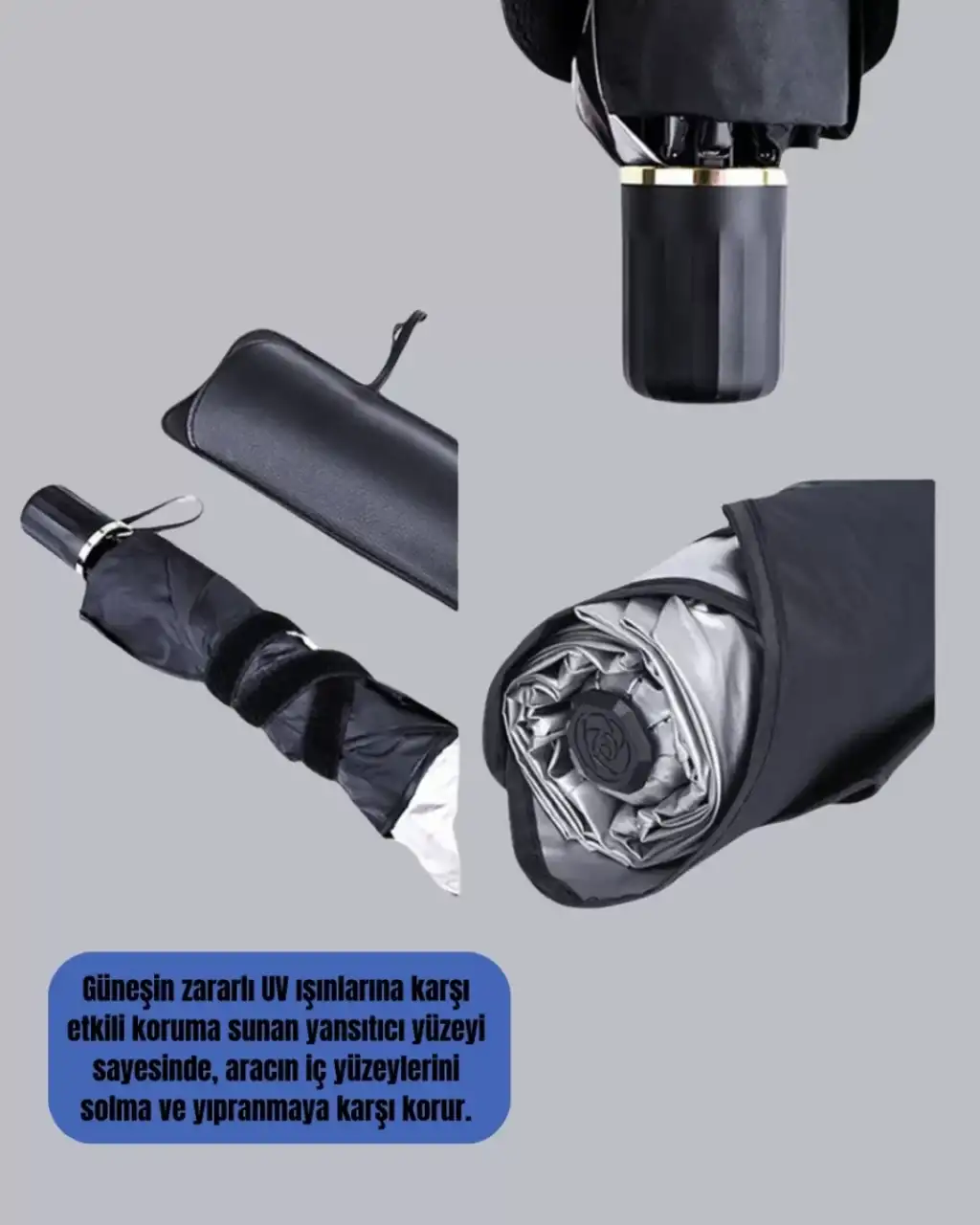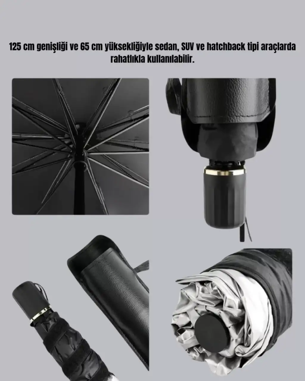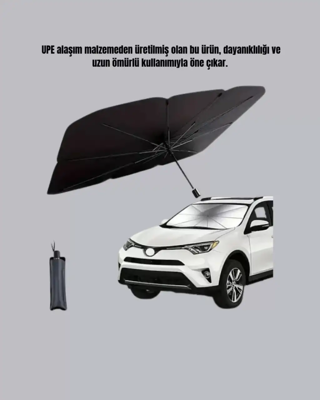 Yeni nesil katlanabilir oto güneşlik, 125 cm genişlik ve 65 cm yükseklik ölçüleriyle sedan, SUV ve hatchback tipi araçların ön camlarına tam uyum sağlar. Özel tasarımı sayesinde hem işlevsel hem de estetik bir kullanım sunar. Yüksek kaliteli UPE alaşım malzeme ile üretilmiş bu güneşlik, uzun ömürlü ve dayanıklıdır.Ürünün yansıtıcı yüzeyi, güneş ışınlarını etkili şekilde geri yansıtarak aracın iç yüzeylerini zararlı UV ışınlarına karşı korur. Bu sayede ön panel, direksiyon ve koltuk döşemelerinde zamanla oluşabilecek solma ve çatlama gibi yıpranmaların önüne geçilir.Şemsiye formunda tasarlanmış olan bu pratik güneşlik, saniyeler içerisinde kolayca açılıp kullanılabilir. Kullanım sonrası ise yine şemsiye gibi katlanarak minimum yer kaplar ve özel saklama çantasına konularak pratik bir şekilde muhafaza edilir.Sıcak yaz aylarında araç içindeki ısıyı önemli ölçüde düşürerek daha serin ve konforlu bir sürüş deneyimi sağlar. Özellikle uzun süre güneş altında kalan araçlarda, klima kullanımını azaltarak enerji tasarrufu da sağlar.Paket içeriği: 1 adet katlanabilir oto güneşlik ve özel taşıma çantası.Hem günlük kullanım hem de seyahatler için ideal, ergonomik ve etkili bir çözümdür.