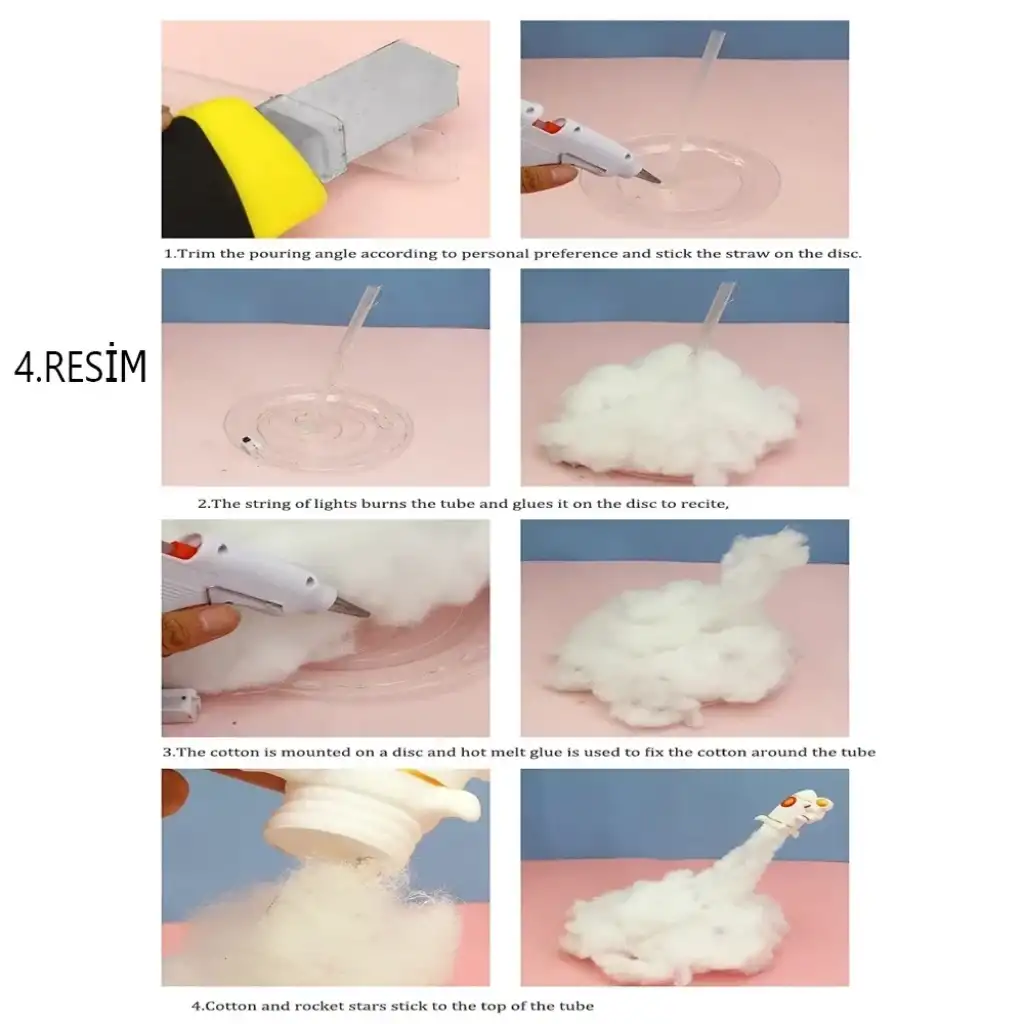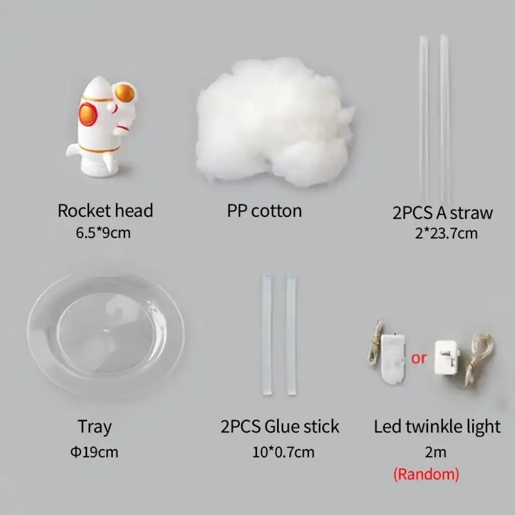 KENDİN YAP UÇAN ASTRONOT TASARIMLI GECE LAMBASIÜrün ÖzellikleriKendin Yap Uçan Astronot Tasarımlı Gece Lambası, hazır haliyle 20x25 cm boyutundadır. Kaliteli plastik malzemeden üretilmiş olan bu gece lambası, demonte halde gönderilmektedir. Paket içerisinde uçan astronot dekorasyonlu roket, pamuk, çubuk ve silikon bulunur. Üründe ayrıca 2 metre şerit LED ışık bulunmakta olup, şerit ışık ile ortamınızı aydınlatırken, şık bir atmosfer yaratır. Hem eğlenceli hem de yaratıcı bir proje olarak kullanılabilir. Uçan astronot, roket üzerinde dekoratif olarak yer alır, bu da ürüne modern bir görünüm kazandırır.Paket İçeriği1 Adet Kendin Yap Uçan Astronot Tasarımlı Gece Lambası (Demonte halde)