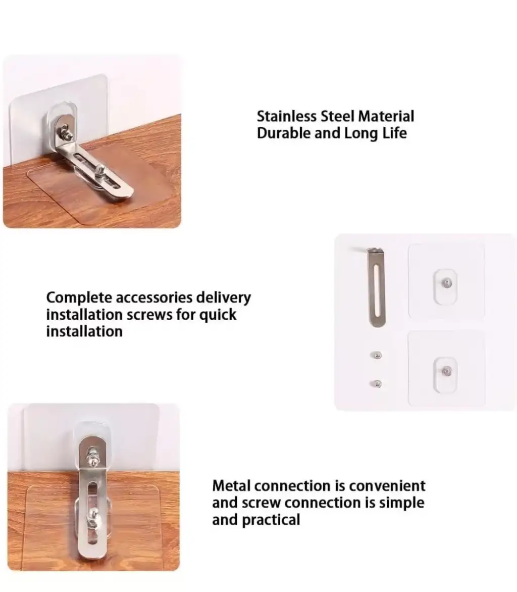 MOBİLYA SABİTLEME APARATIÜrün ÖzellikleriMobilya sabitleme aparatı, devrilme ve düşme riski olan eşyalarınızı güvenli bir şekilde sabitlemek için tasarlanmıştır. Nem ve su geçirmez özelliğe sahip bu aparat, yüksek viskoziteli yapışkanları sayesinde zemine güçlü bir şekilde tutunur ve dayanıklılık sağlar. Kolay kurulumu ile pratik bir kullanım sunar. Yapıştırılacak alanı bir bezle temizledikten sonra, yapışkan yüzeyleri ayırarak duvara ve sabitlenecek eşyaya kolayca monte edebilirsiniz. Sabitleyici kilit mekanizması, eşyalarınızın güvenliğini artırır.Deprem ve çocuk koruması sağlayan bu aparat, yüksek kaliteli metal tokalar ve güçlü yapışkan bantlardan oluşur. Kurulumdan sonra sağlam bir sabitleme sağlar ve uzun yıllar boyunca kullanılabilir. Gardırop, kitaplık, TV dolabı, şifonyer gibi mobilyalar için geniş bir kullanım alanına sahiptir.Paket İçeriği1 adet sabitleme aparatı seti (2 adet vidalı yapışkan + 1 adet metal parça)