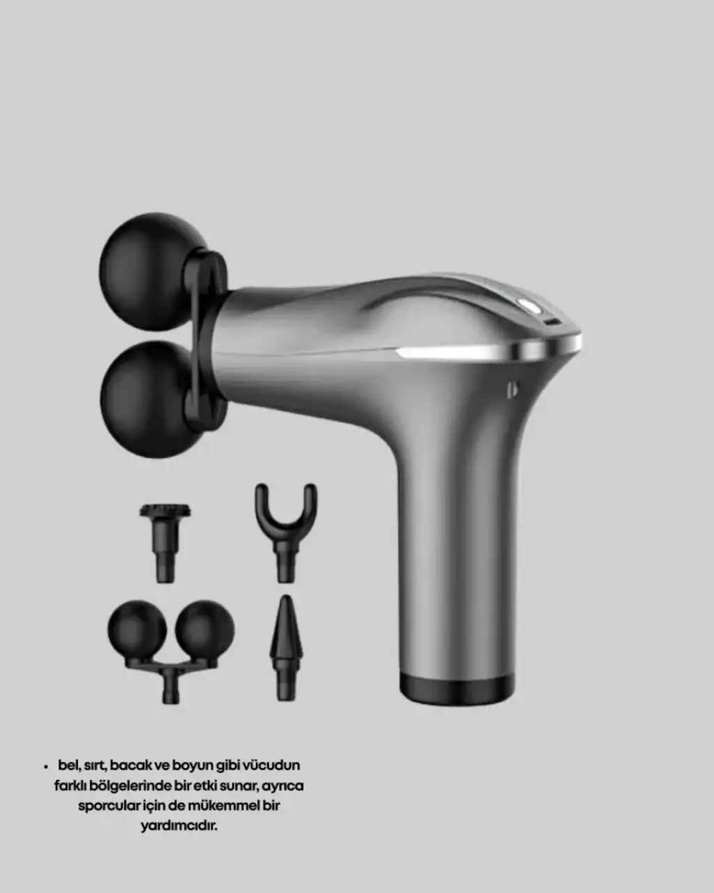 Şarjlı 4 başlıklı masaj tabancası, kas gerginliğini azaltmak ve vücudu rahatlatmak için geliştirilmiş çok yönlü bir masaj aletidir. Vücudun bel, sırt, boyun, bacak gibi çeşitli bölgelerinde etkili sonuçlar sunar. Günün yorgunluğunu atmak veya spor sonrası kasları rahatlatmak isteyen herkes için ideal bir çözümdür.Cihazla birlikte gelen dört farklı başlık, farklı kas grupları için özel olarak tasarlanmıştır. Büyük kas gruplarında geniş yüzeyli başlık tercih edilirken daha küçük kas bölgelerinde dar uçlu başlıklar ideal performans sağlar. Bu sayede kullanıcı kendi masaj deneyimini ihtiyaçlarına göre şekillendirebilir.Titreşim teknolojisiyle çalışan cihaz, kas derinlerine ulaşıp etkili bir gevşeme sağlar. Kas sıkışmalarını, gerginliği ve sertliği hafifletmek için kullanılabilir. Sporcular için antrenman sonrası toparlanmayı hızlandıran güçlü bir yardımcıdır.Şarjlı yapısı, cihazı tamamen kablosuz kullanma özgürlüğü sunar. Hem taşınabilir hem hafif olması sayesinde çantaya konulabilir ve her yerde kullanılabilir. Ev, ofis, spor salonu, seyahat gibi tüm ortamlarda pratik kullanım sağlar.Çoklu hız ayarı, masaj yoğunluğunu tamamen kullanıcı kontrolüne bırakır. İster hafif bir gevşeme ister güçlü bir kas masajı yapmak istiyor olun, cihaz her ihtiyaca uygun performans sunar.Ergonomik tasarımı elde rahat kavrama sağlar ve uzun süre kullanımda bile yorgunluk oluşturmaz.Günlük stres, yoğun iş temposu, spor sonrası kas ağrıları gibi durumlarda vücuda hızlı bir rahatlama sunan bu masaj tabancası, fonksiyonelliği ve estetik tasarımıyla öne çıkan etkili bir kişisel bakım ürünüdür.