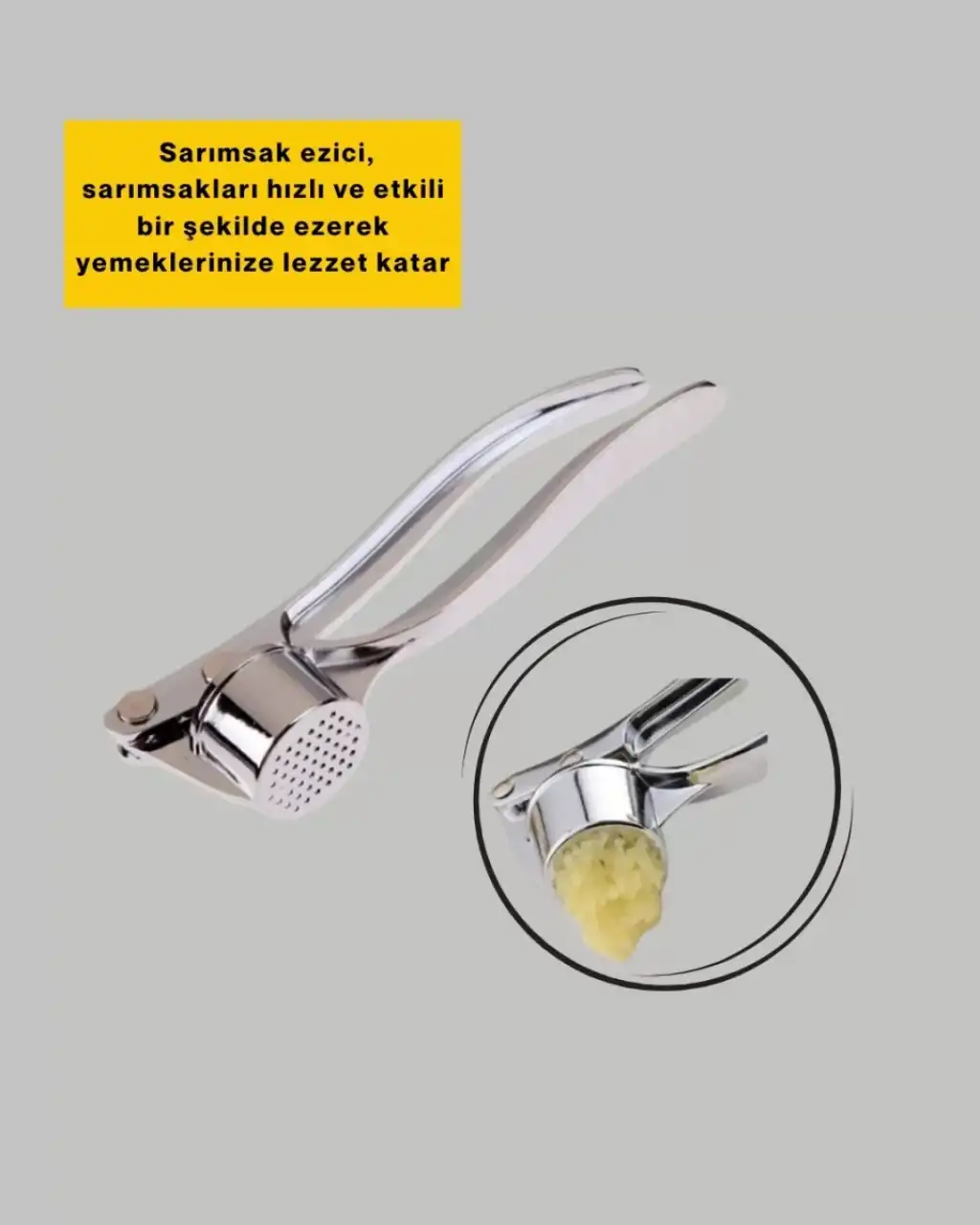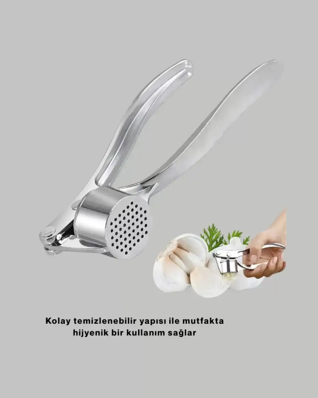 Bu yüksek kaliteli metal sarımsak ezici, sağlam paslanmaz gövdesi ile uzun ömürlü bir kullanım sağlar. Aşınma, paslanma, çizilme ve deformasyonlara karşı dayanıklı olan bu ürün, en zorlu mutfak koşullarında bile performansını korur. Sık kullanıma uygundur ve yıllar boyu işlevini yitirmez.Sarımsağı ince dokulu bir püre hâline getirerek yemeklerin lezzet dengesini artırır. Ezme haznesi geniştir ve büyük sarımsak dişlerini bile rahatça sıkabilir. Mekanizması güçlü olup minimum kuvvet uygulamanız yeterlidir. Özel tasarlanmış döner kafa sistemi, sarımsağı eşit basınçla ezer ve maksimum verim sağlar.Hijyen dostu metal yüzey bakteri oluşumunu engeller ve kokuyu içine haps etmez. Bu sayede kullanım sonrası temizlik son derece hızlıdır. Suya dayanıklı yapısı sayesinde elde yıkama için idealdir. Küçük boyutları ile mutfak çekmecelerinde yer kaplamaz.Profesyonel şefler, ev hanımları ve mutfakla ilgilenen herkes için mükemmel bir mutfak yardımcısıdır. Dayanıklı, hijyenik ve şık tasarımına ek olarak fonksiyonelliğiyle öne çıkan bir üründür.