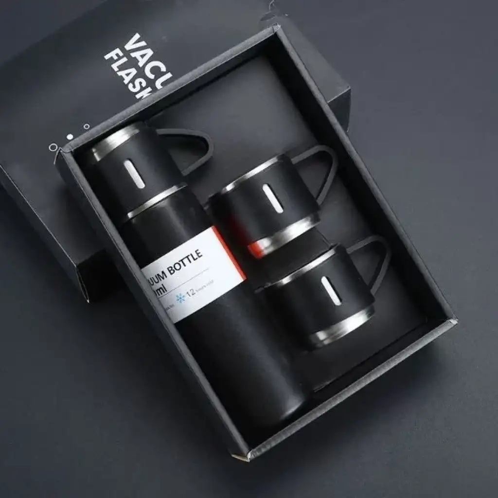 PASLANMAZ ÇELİK BARDAKLI TERMOS SETİ 500 ML.Ürün ÖzellikleriTutma kulp sayesinde kolayca taşınır.3 adet bardağı mevcuttur.2 katmanlı hassas teknoloji, ısı ve soğuk yalıtımlıdır. Kaydırmaz taban özelliği ile her zemine güçlü tutuş sağlar.12 saat sıcak ve soğuk tutma özelliğine sahiptir.500 ML kapasitesi mevcuttur.304 paslanmaz çelik kalitesi. Ürünün Ebatları:24 cm x 6,6 cm (bardak kulpu dahildir.) Paket İçeriği1 adet paslanmaz çelik bardaklı termos seti 500 ml.