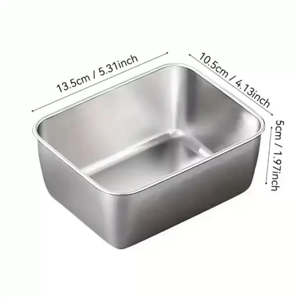 PASLANMAZ ÇELİK SAKLAMA KABIÜrün ÖzellikleriPaslanmaz çelik saklama kabı, dayanıklı ve şık tasarımıyla uzun ömürlü kullanım sağlar. Bu kabın boyutları 13.5 cm x 10.5 cm x 5 cm olup, çeşitli mutfak gereçleri ve gıda saklama ihtiyaçları için idealdir. Paslanmaz çelik malzeme, koku geçirmez ve gıda güvenliği sağlar, ayrıca kolayca temizlenebilir ve dayanıklıdır. Hem evde hem de ticari kullanımlar için mükemmel bir tercihtir.Paket İçeriği1 Adet Paslanmaz Çelik Saklama Kabı