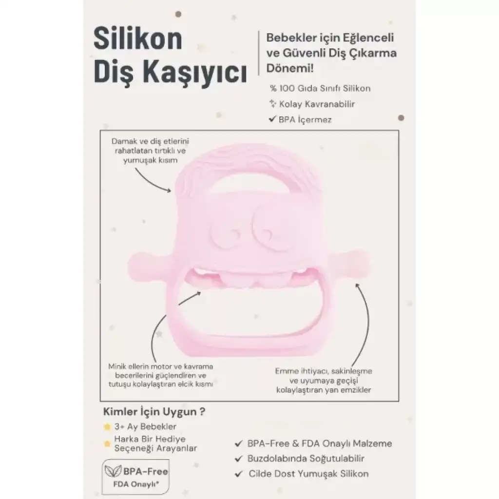 PEMBE BEBEK SİLİKON DİŞ KAŞIYICIÜrün ÖzellikleriPembe silikon bebek diş kaşıyıcı, bebeklerin diş çıkarma dönemini güvenli, rahatlatıcı ve keyifli hale getirir. Sevimli tasarımı ve farklı dokulara sahip yüzeyleri sayesinde hassas diş etlerine nazikçe masaj yaparak yatıştırır. Çok yönlü tutma alanları ile minik eller için kolay kavranabilir bir deneyim sunar.Çift yönlü emzik kolları, bebeklerin doğal emme refleksini desteklerken parmak emmenin önüne geçmeye yardımcı olur. Aynı zamanda çene kaslarını çalıştırarak ağız ve çene gelişimine katkıda bulunur. Hafif, esnek ve ergonomik yapısı sayesinde bebekler kolayca kavrayabilir.Sadece rahatlatıcı bir ürün olmakla kalmaz, aynı zamanda motor ve duyusal gelişimi destekleyen bir oyun arkadaşıdır. Farklı dokular bebeğin dokunsal keşfini teşvik ederken, kavrama becerisini güçlendirir. %100 gıda sınıfı silikon malzeme ile üretilmiştir, BPA, BPS ve zararlı kimyasallar içermez. Yeni doğan döneminden itibaren güvenle kullanılabilir.Paket İçeriği1 adet Pembe Bebek Silikon Diş Kaşıyıcı