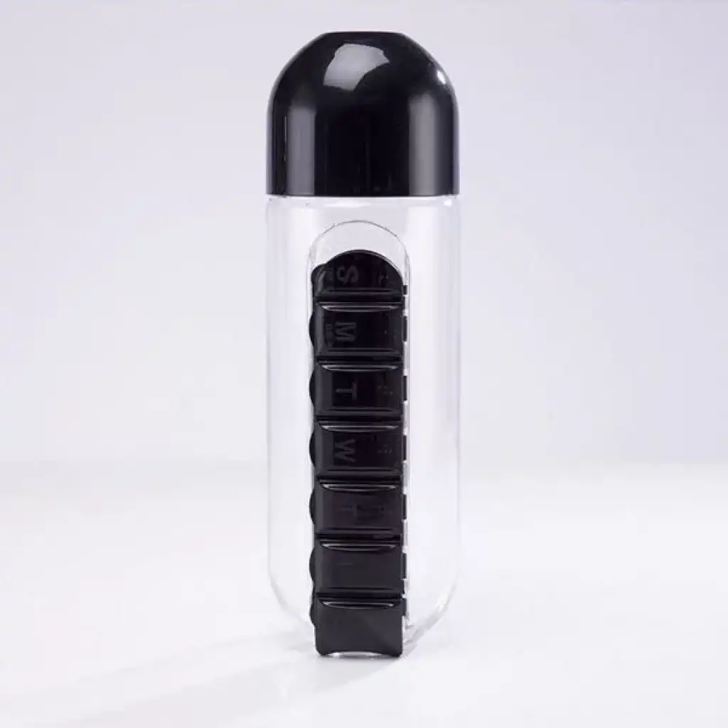 PİLLBOX SU MATARASIÜrün ÖzellikleriSu matarasını isterseniz pillboxlı isterseniz pillboxsız olarak kullanabilirsiniz.Pillboxı mataradan kaydırarak çıkarabilirsiniz.Pillbox kısımında haftanın her gününe ayrılmış günlerin baş harfleri bulunur.Sağlık için %100 BPA içermeyen malzemeden üretilmiştir ve güvenlidir.600 ml kapasitelidir.Paket İçeriği1 adet pillbox su matarası