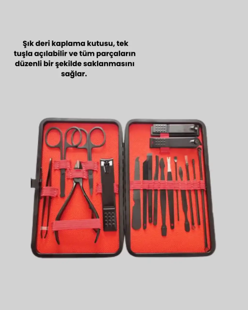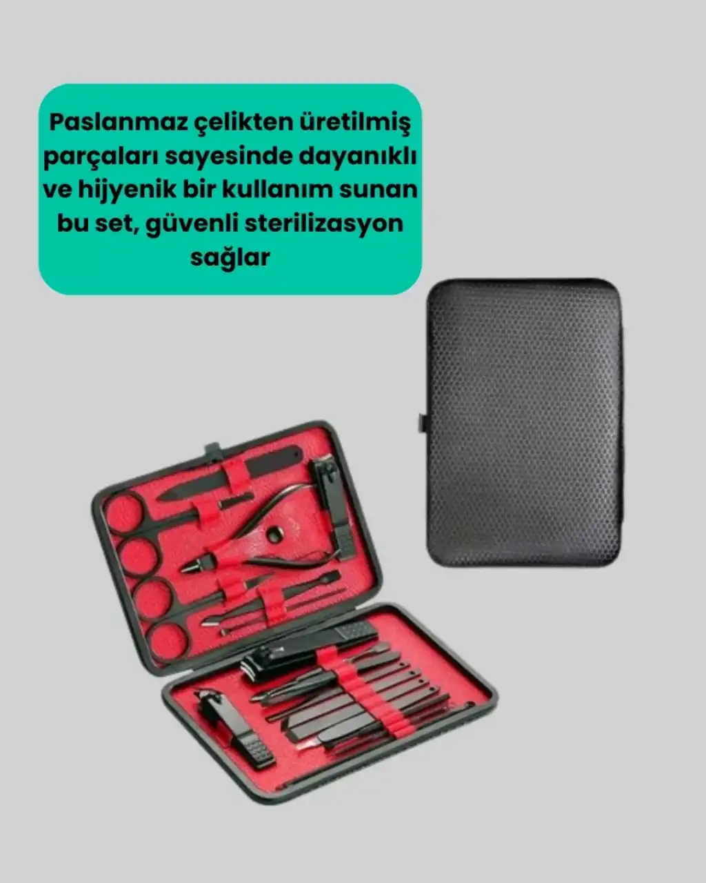 Profesyonel bakım kalitesini evinize getiren 17 parçalık manikür seti, el ve ayak bakımında ihtiyacınız olan tüm araçları bir arada sunar. Paslanmaz çelikten üretilmiş aletleriyle dayanıklı ve hijyenik bir kullanım sağlar. Korozyona dayanıklı yapısı uzun ömürlü kullanım sunarken, keskinliği sayesinde pratik ve net sonuçlar almanıza yardımcı olur. İçeriğinde farklı boyutlarda tırnak makasları, törpü, cımbız, pedikür bıçakları, tırnak kaldırma aparatı ve kulak temizleme aparatı yer alır. Yeni nesil siyah kaymaz kaplama teknolojisi, aletlerin kaymadan kullanılmasını sağlar. Özel deri kaplama kutusu, şık görünümüyle parçaları düzenli şekilde saklamanıza imkan tanır. Hafif ve kompakt yapısıyla çantanızda kolayca taşıyabilir, seyahatlerde yanınızda bulundurabilirsiniz. Günlük kullanım için ideal olan bu set, hediye seçeneği olarak da öne çıkar.