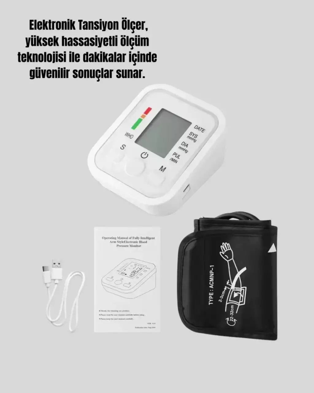 Dijital tansiyon ölçer cihazı, yüksek doğruluk oranı ve kullanıcı dostu tasarımı ile öne çıkıyor. 2 kullanıcı için ayrı ayrı 99 ölçüm hafızası bulunan bu cihaz, aile üyelerinizle birlikte kolayca kullanılabilir. Kan basıncı dalgalanmalarını düzenli şekilde takip ederek sağlığınızı kontrol altında tutabilirsiniz. LCD dijital ekranı sayesinde ölçüm sonuçlarını net ve okunabilir bir şekilde görmeniz mümkündür.Cihaz, IHB aritmi tespiti ile kalp ritminizdeki düzensizlikleri fark ederek olası riskleri önceden belirlemenize yardımcı olur. Nabız tarama ve osilometri yöntemleriyle ölçüm yapabilmesi, cihazın güvenilirliğini artırır. Ölçüm aralığı 20mmHg - 280mmHg arasında olup ±3mmHg hassasiyet sunar. Nabız doğruluğu ise ±%3 seviyesindedir.Taşınabilir yapısı ve 300 gr’lık hafifliği sayesinde evde, iş yerinde veya seyahatte kolayca kullanılabilir. Enerji ihtiyacı 4xAAA pil ile sağlanabileceği gibi, Android cihazlar için uyumlu USB şarj kablosu ile de kullanılabilir. Kutudan çıkan tansiyon bandajı ve kullanım kılavuzu ile herkes rahatlıkla cihazı kullanabilir. Sağlıklı yaşamı önemseyenler için bu tansiyon ölçer günlük kullanımda vazgeçilmez bir yardımcıdır.