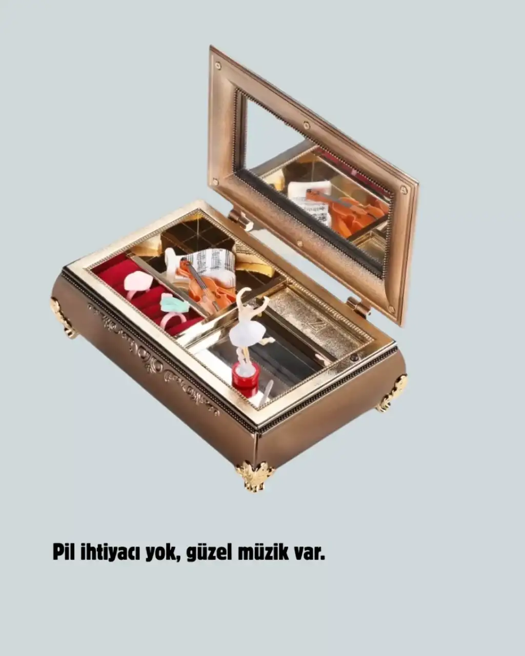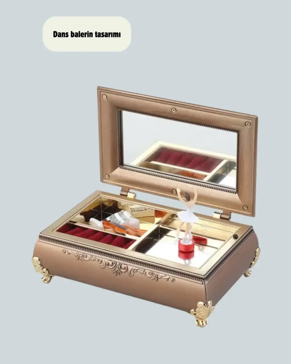 Balerinli müzikli takı kutusu, şık piyanovari tasarımı ile hem görsel hem işlevsel açıdan zengin bir üründür. Fırınlama boya tekniği sayesinde yüzeyi dayanıklıdır ve uzun süre yeni görünümünü korur. Parlak beyaz veya pastel tonlara sahip olması, ürünü özellikle kız çocuklarının odalarında romantik bir dekor haline getirir.Kutunun iç kısmında balerin figürü yer alır. Müzik başladığında bu figür eşliğinde oluşan görüntü, masalsı bir hava yaratır ve ürüne benzersiz bir karakter kazandırır. Melodi, ortamda hoş bir atmosfer oluşturur ve ürünü sadece bir takı kutusu olmaktan çıkarıp duygusal bir obje haline getirir.Takı kutusu içinde bulunan bölmeler yüzük, bileklik, küpe ve kolye gibi aksesuarların düzenli bir şekilde saklanmasına imkân tanır. Bu sayede hem estetik bir kutu elde edilir hem de takılar kaybolmadan düzenli biçimde korunur.Ürün hediye olarak verildiğinde de çok beğeni toplar. Bale ve müzik seven kız çocukları, genç kızlar veya nostaljik ürünleri seven yetişkinler için ideal bir armağandır. Özel günlerde kalıcı bir anı oluşturmak isteyenler için etkileyici bir tercihtir.Piyano formundaki dış tasarım; makyaj masası, komodin, raf ve vitrin gibi alanlarda dekoratif bir obje olarak kendini gösterir. Estetik çizgileri sayesinde yaşam alanına sanatsal bir dokunuş katar.Balerinli müzikli takı kutusu, hem tasarımının romantik havası hem işlevsel kullanım avantajlarıyla, her yaş grubuna hitap eden çok özel bir üründür. Hem şıklığı hem düzen sağlama işleviyle yaşam alanlarını güzelleştirir ve unutulmaz bir hediye seçeneği oluşturur.