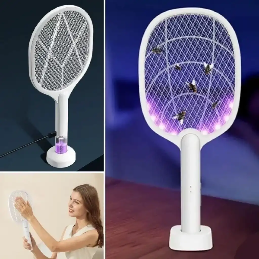 ŞARJLI STANDLI SİNEK ÖLDÜRÜCÜ RAKETÜrün ÖzellikleriŞarjlı standlı sinek öldürücü raket, 5W güçlü performansı ve UV mor ışık teknolojisi sayesinde sinek ve uçan böcekleri hızlı ve etkili şekilde yakalamak için tasarlanmıştır. UV mor ışık, sivrisinekleri ve haşereleri kendine çekerken yüksek voltajlı tel örgü temasıyla anında etkisiz hale getirir. Şarj edilebilir bataryası sayesinde kabloya ihtiyaç duymadan ev içinde ve dış mekânlarda rahatça kullanılabilir. Masaüstü standı ile sabit kullanım imkânı sunarken, el tipi yapısı sayesinde taşınabilir olarak da kullanılabilir. Hafif ve ergonomik tasarımı uzun süreli kullanımlarda bile konfor sağlar. Sessiz ve gürültüsüz çalışma özelliği sayesinde gece kullanımına uygundur. Kimyasal içermeyen yapısı ile çevre dostu ve güvenli bir sinek kontrol çözümü sunar. Ev, ofis, balkon, bahçe ve kamp alanlarında pratik ve etkili kullanım için idealdir.Paket İçeriği1 adet şarjlı sinek öldürücü raket