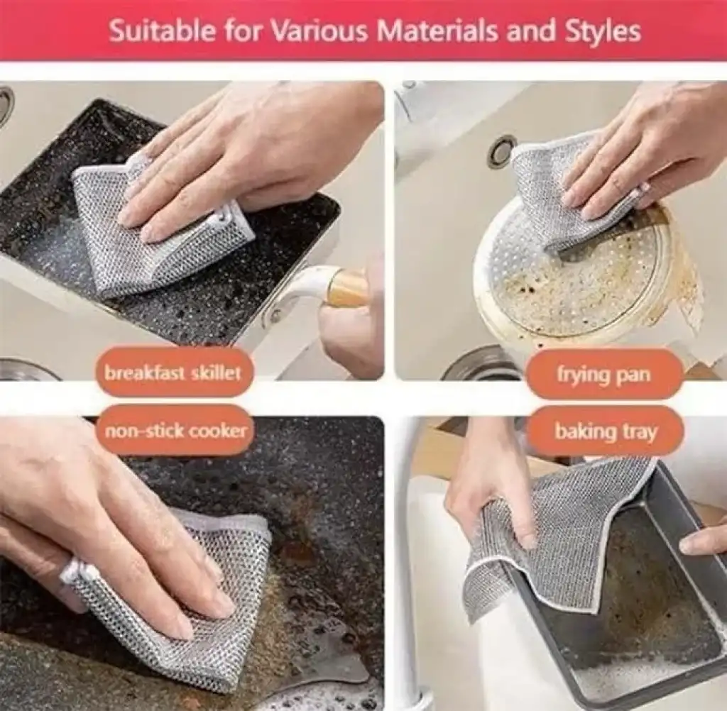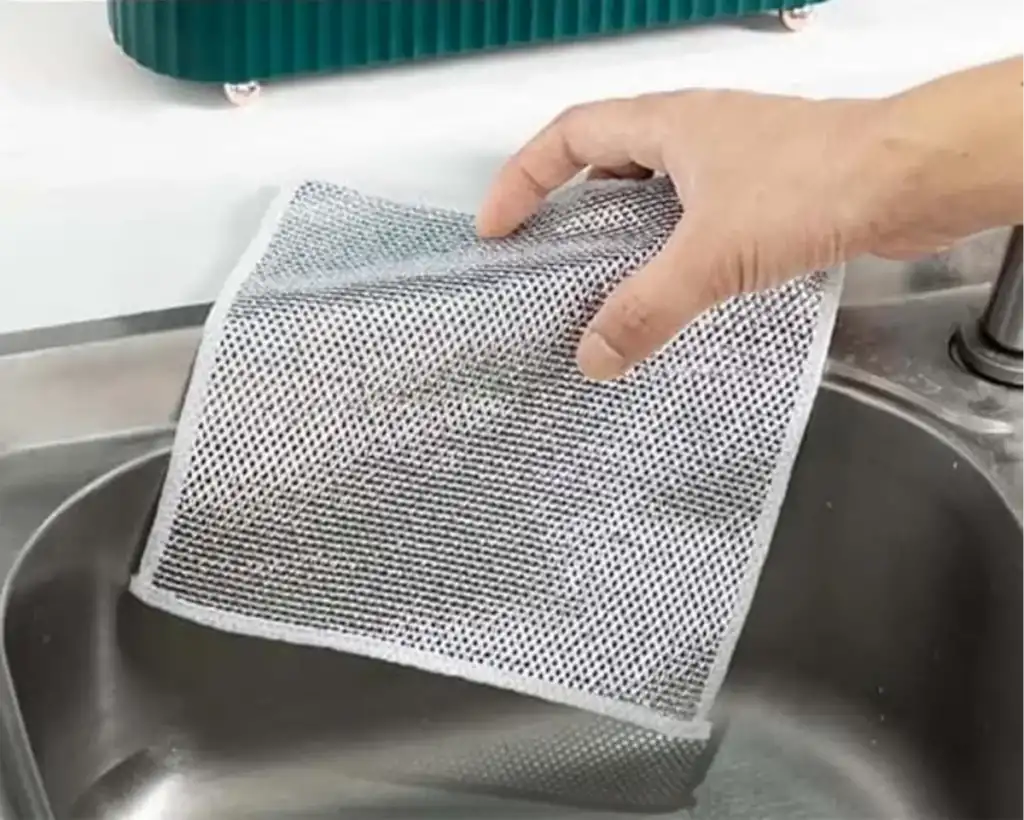 TENCERE TAVA OVMA BEZİ- Malzeme: Naylon- Renk: Alüminyum rengi- Boyut: 20 cm x 20 cm- Kullanım Alanları: Tencere, tava ve zorlu bulaşıkların temizliği için ideal- Özellikler: Çizik yapmaz, çok yönlü kullanım- Uygulama Alanları: Tezgahlar, gümüş eşyalar, fayanslar, yağlı ve kirli yüzeyler için uygundur.Bu tencere tava bulaşık bezi, naylon malzemesi ve özel tasarımıyla çizik yapmadan zorlu bulaşıkların temizliğine yardımcı olur. Alüminyum rengi görünümüyle şık bir görünüme sahiptir. 20 cm x 20 cm boyutlarıyla elinize rahatça oturur ve kullanımı kolaydır. Çeşitli yüzeylerde kullanılabilen bu bez, tezgahlar, gümüş eşyalar, fayanslar ve yağlı/kirli yüzeyler için idealdir.Paket İçeriği1 adet tencere tava ovma bezi