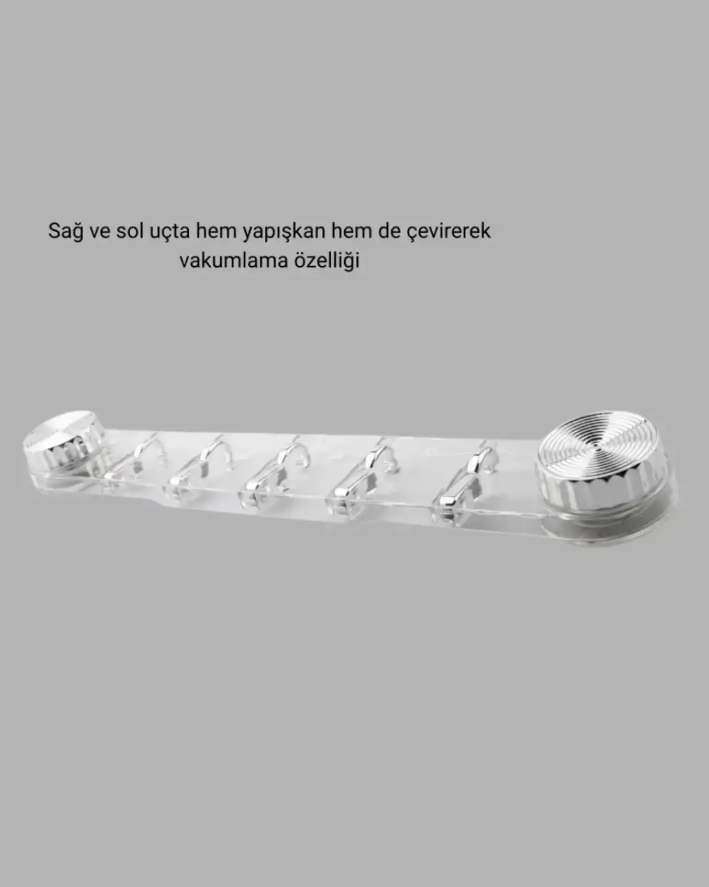 Vakumlu ve yapışkanlı askı aparatı, mutfak ve banyo alanlarında düzeni kolayca sağlamak için tasarlanmıştır. Beş askı bölmesi sayesinde farklı eşyaları bir arada ve düzenli şekilde asmanıza yardımcı olur. Günlük kullanımda sık ihtiyaç duyulan ürünlerin pratik şekilde organize edilmesini sağlar.Sağ ve sol uçlarda bulunan vakumlu sistem, yüzeye çevirerek sabitleme imkânı sunar. Yapışkanlı destek, askılığın sağlam durmasına katkı sağlar. Fayans, cam ve parlak yüzeylerde güçlü tutunma sağlayarak güvenli kullanım sunar. Alet gerektirmeyen montaj yapısı, ürünü kısa sürede kullanıma hazır hale getirir.Şeffaf orta bölüm, modern ve sade bir görünüm kazandırır. Bu tasarım, ürünü hem mutfak hem de banyo dekorasyonuna uyumlu hale getirir. Suya ve buhara dayanıklı yapısı sayesinde nemli ortamlarda uzun süreli kullanım için uygundur.Askılık, alan tasarrufu sağlayarak yaşam alanlarını daha düzenli hale getirir. Havlu, lif, mutfak bezleri ve küçük aksesuarlar için ideal bir çözümdür. Vakumlu ve yapışkanlı mutfak banyo askılığı, pratik kurulumu, dayanıklı yapısı ve çok yönlü kullanımı ile ev düzenini destekleyen fonksiyonel bir üründür.