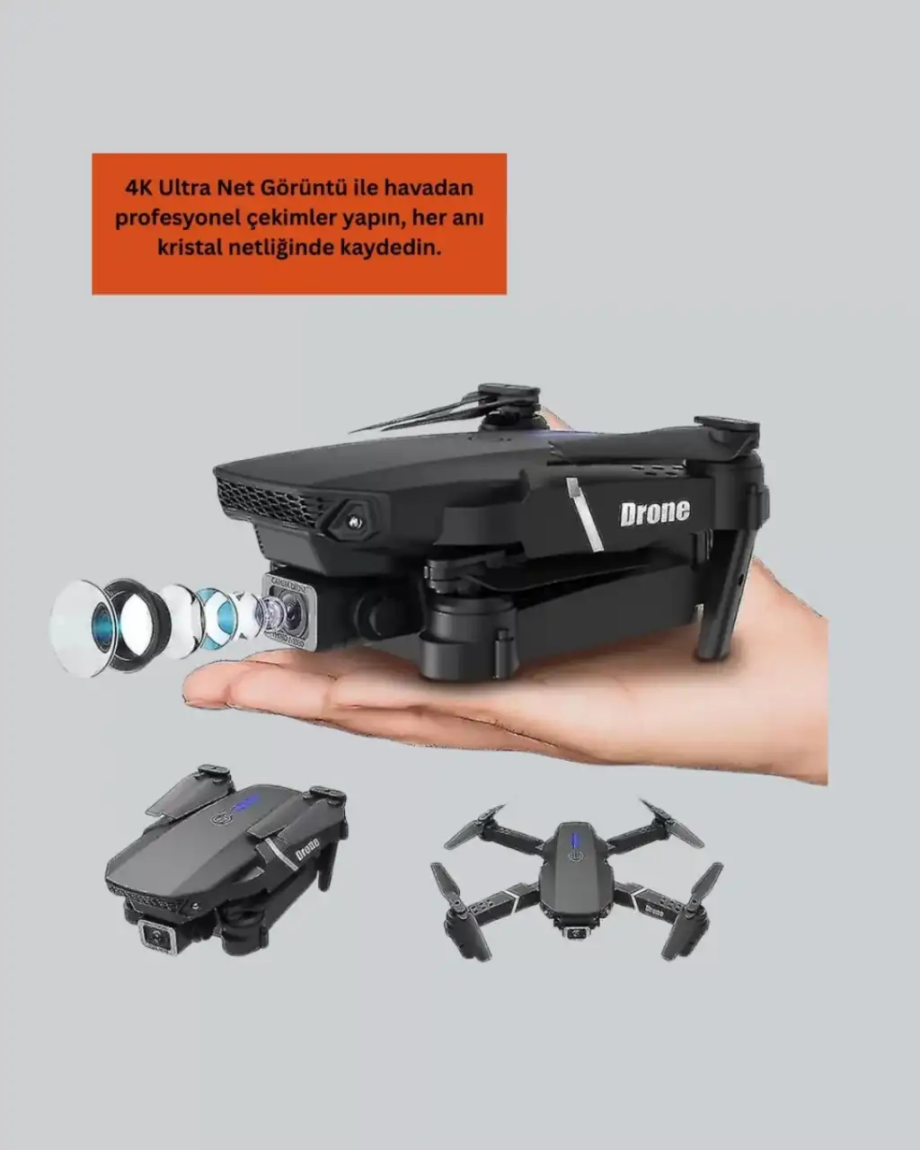 Profesyonel çekimler için tasarlanmış bu katlanabilir drone, üstün teknolojisi ile güvenli ve kolay bir uçuş deneyimi sunar. Katlanabilir kolları sayesinde taşınması kolaydır ve seyahatlerde size eşlik ederek muhteşem anılar kaydetmenize yardımcı olur. Kompakt tasarımı, özellikle şehir içi kullanımlarda pratiklik sağlar.Yükseklik sabitleme modu, stabil uçuş için idealdir. Bu özellik sayesinde cihazınızı kontrol ederken net görüntüler elde edebilirsiniz. 4K kamera seçeneği, yüksek çözünürlüklü çekimler yapmanızı sağlarken, Wi-Fi fonksiyonu ile görüntüleri anında telefonunuza aktarabilirsiniz.Başsız mod, uçuş sırasında yön kaybını ortadan kaldırarak kullanıcıya kolaylık sağlar. Tek tuşla eve dönüş özelliği, cihazınızı kaybetme riskini sıfıra indirir. Yörünge uçuş modu sayesinde istediğiniz rotayı belirleyebilir ve drone’un bu rota üzerinde otomatik uçmasını sağlayabilirsiniz.2.4GHz frekans teknolojisi ile güçlü ve kesintisiz bağlantı elde edebilir, 100 metreye kadar kontrol mesafesi ile geniş bir uçuş alanında cihazınızı kullanabilirsiniz. 12-15 dakika uçuş süresi sunan 1800mAh bataryası, 100 dakikalık kısa şarj süresi ile tekrar kullanıma hazır hale gelir.360° takla özelliği ile uçuş deneyiminize eğlence katabilir, yaratıcı çekimler yapabilirsiniz. Hafif ve şık tasarımı, her yaş grubundan kullanıcıya hitap eder. Hem amatörler hem de profesyoneller için uygun olan bu drone, güvenli, güçlü ve keyifli bir uçuş deneyimi sunar.