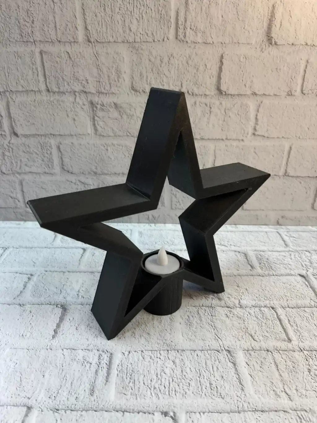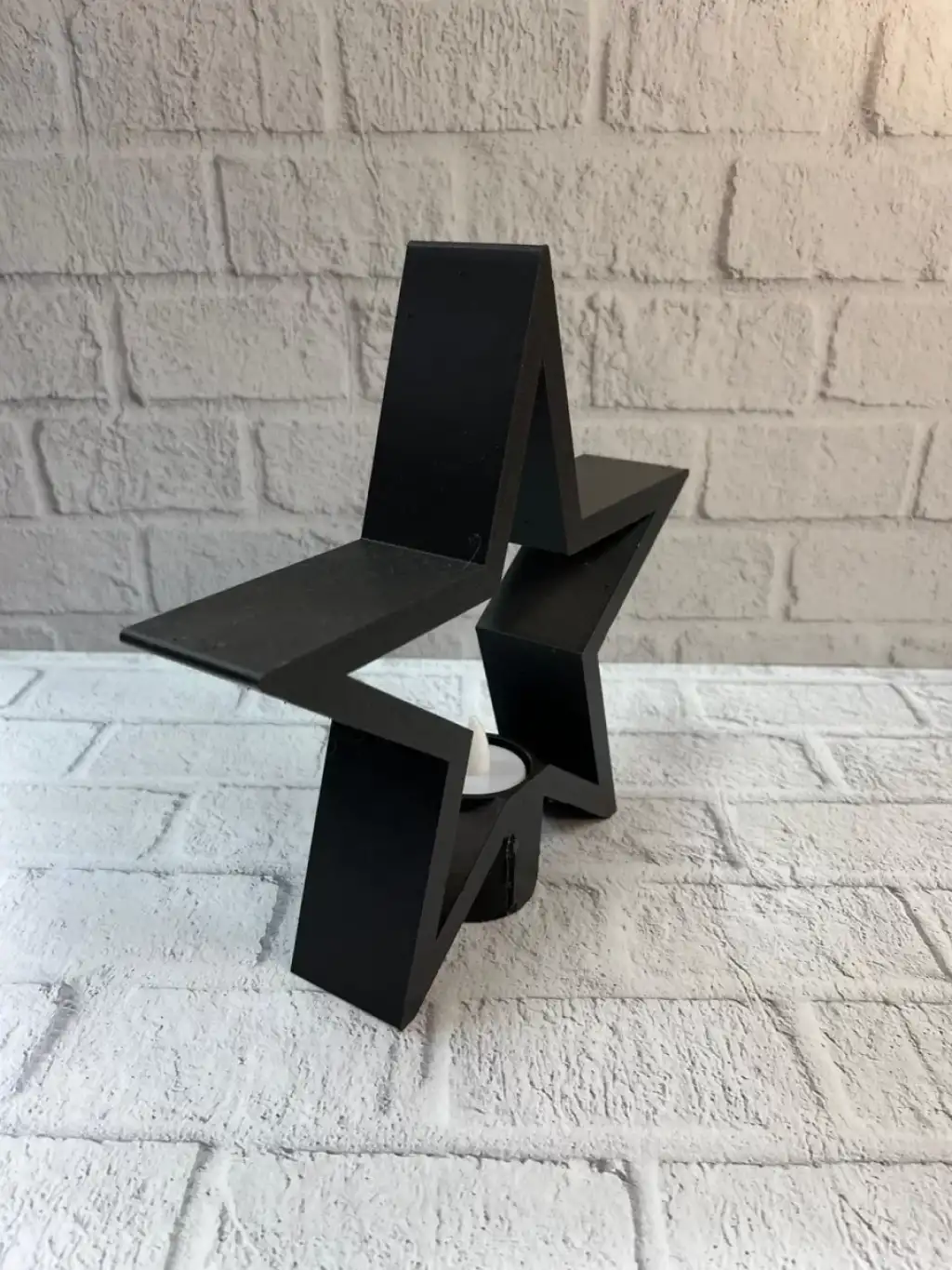 Siyah yıldız mumluk, sade tasarımıyla dekorasyonda güçlü bir etki yaratır. Raf üstü, masa veya köşe alanlarda tek başına kullanıldığında bile dikkat çekici bir görünüm sunar. Mum ışığıyla birleştiğinde sıcak, loş ve davetkâr bir salon ambiyansı oluşturur. Dekoratif ve işlevsel yapısıyla hem ev hem ofis kullanımı için uygundur.