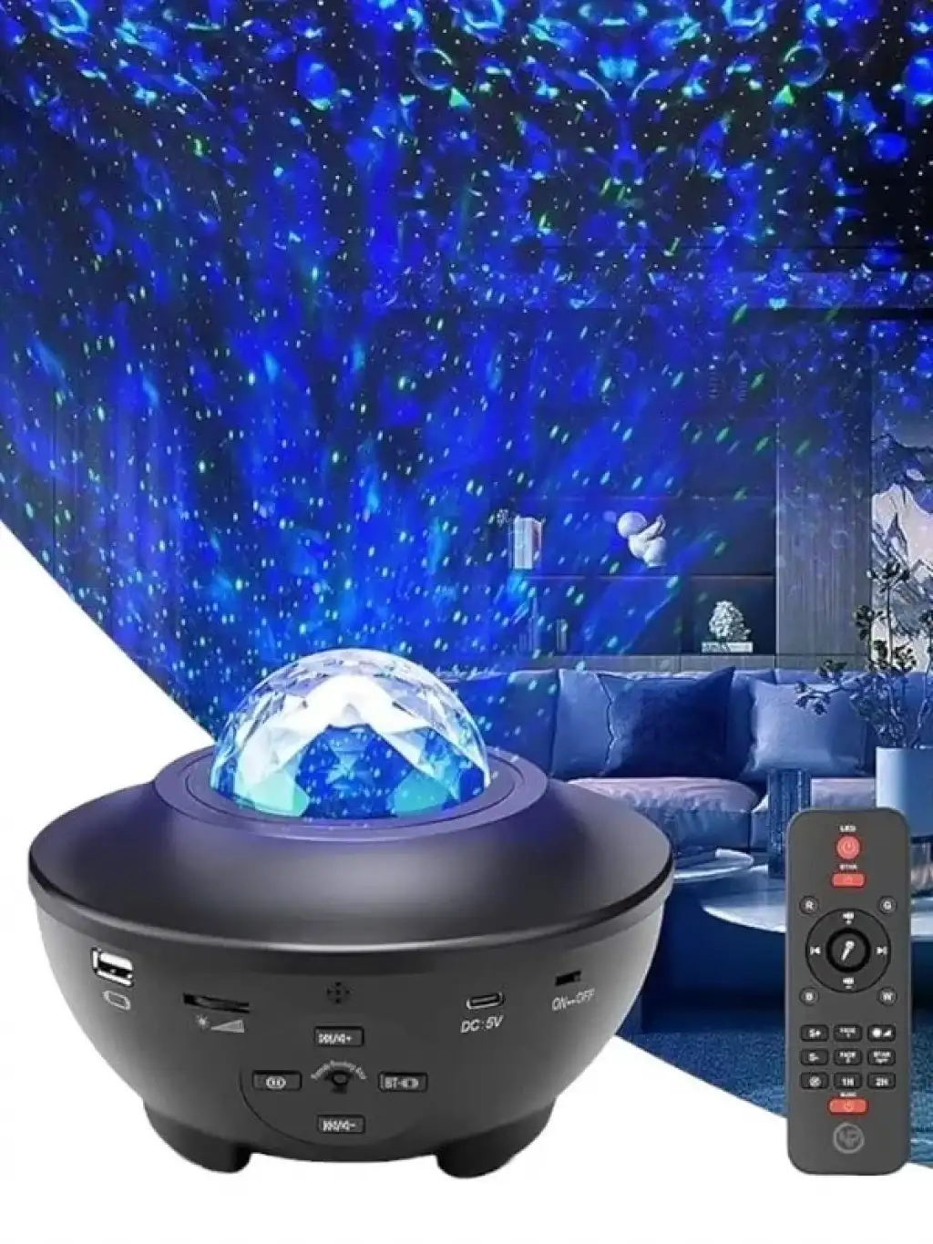 * 10 renk dinamik projeksiyonlar: beş standart renk, kırmızı su dalgası, mavisu dalgası, yeşil su dalgası, beyaz su dalgası ve yeşil lazer noktası, her ikirenk karıştırılabilir ve her iki su dalgası rengi de yeşil lazer noktası ilekarıştırılabilir, Böylece en fazla 10 renk alabilirsiniz. Size muhteşem biryıldızlı ışık göstermek için, farklı hızların dinamik gece projeksiyonu ilekombine çeşitli renkler, rahat, romantik, renkli bir uzay projeksiyon ortamıyaratmak.* Uzaktan kumanda ve müzikal: uzaktan kumanda ile (2XAAA pil kullanın-dahildeğildir), gece ışığını açmak veya kapatmak için yataktan veya kanepedençıkmaktan endişelenmenize gerek yok, uzaktan da yıldız projektör ışık kontroledebilirsiniz, renkli ışıklar, parlaklığı ayarlamak, serbestçe açmak/kapatmaklamba, aydınlatma modunu değiştirmek, Müzik şarkıları, zamanlayıcı. En son sesetkinleştirilmiş titreme modu, projeksiyonun rengi müzik ritmine göredeğiştirmesini veya ellerinizi çırpmasını sağlar ve bu da yıldızlı birprojeksiyon ile sonuçlanır.* Bluetooth hoparlörler ve zamanlayıcılar: favori müziğinizi Bluetooth veya USBüzerinden seçebilirsiniz. Yüksek kaliteli müzik ve yıldızlı projeksiyonlar geceromantik ve yatıştırıcı bir ortam yaratır. Zamanlayıcı seçeneği daha enerjiverimli, ayrıca tüm gece ışığını da atabilirsiniz.* Otomatik kontrol zamanlayıcısı: dinamik bulutsu'nun yıldız projektör ışıkdahili 1H, 2H, otomatik kapanma zamanlayıcısı, gece ışık projektör projektörışık önceden ayarlanmış süreden sonra otomatik olarak kapanacaktır. Ve tabiiki, zamanlayıcı tüm gece boyunca kalmak için iptal edilebilir.* Aile ve çocuklar için hediyeler: yıldız projektör gece lambası doğum günüiçin uygundur, parti, düğün, oda dekor, çocuk günü, noel, yıldönümü hediyeler,harika ve yıldızlı bir atmosfer yaratır, çocukların meraklarını, hayal gücünü,yaratıcılıklarını teşvik etmelerine yardımcı olur. Ayrıca bir okyanus dalgasıprojektör, romantik ruh ışık, gece lambası ve başucu lambası olarak içdekorasyon için mükemmelleştirir.* Müzik yıldızlı gece ışık projektör: yıldızlı gece lambası, bebekler için iyibir uyku ortamı yaratarak, aileniz veya arkadaşlarınız için unutulmaz bir gecegösteren, duvarlara ve tavana gerçekçi bir yıldızlı gece yansıtabilir.
