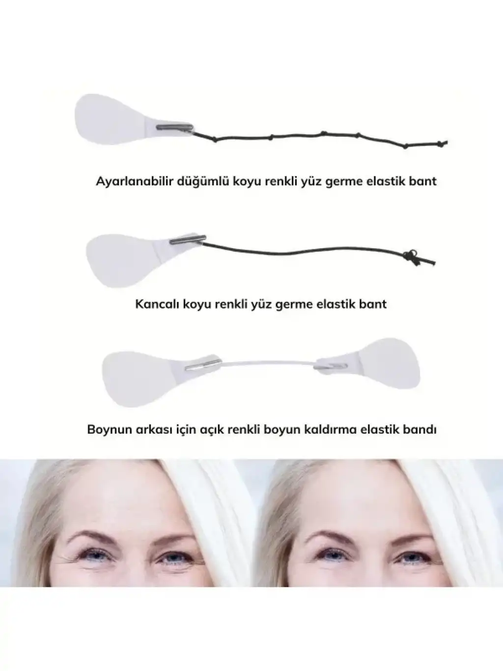 Lastikli Yüz Kaş Göz Boyun Gerdirme Bantları (40 Adet)Ürün Özellikleri:V Şekilli Bir Yüz için: Yüz germe pedleri, iyi esnekliğe sahip su geçirmezdir ve cildinizi rahatsız etmez. V şeklinde bir yüz oluşturmak için cildinizi kaldırabilir ve sıkılaştırabilir.Yumuşak ve Rahat: 40 adet hipoalerjenik yüz germe bantları vardır ve bunlar çevre dostu silikon kauçuk malzemelerden yapılmıştır, kullanımı güvenlidir, sağlıklı, yumuşak ve rahattır.Mükemmel Yüz Germe: Yüz ve boyun germe seti, gevşek cildi iyileştirir ve yüz, boyun, çene ve göz bölgesindeki kırışıklıkları ortadan kaldırır.Daha Genç Olun: Yüz germe bandı, sarkan yüz kaslarını germeye yardımcı ve yüzünüzü şekillendirmeye yardımcıdır. İlk kullanımla beraber daha genç görünecek ve harika hissedeceksiniz.Geniş Uygulamalar: Yüz germe bandı özel günler, düğünler, toplantılar, modellik, fotoğraf çekimi, seyahat vb. için idealdir. İnce, sıkı ve güzel bir yüzün şekillendirilmesine yardımcı olur.Malzeme: Silikon,kauçukRenk: şeffafPaket İçeriği:40 adet Yüz Germe Bandı ve Kademeli Uygulama Lastikleri