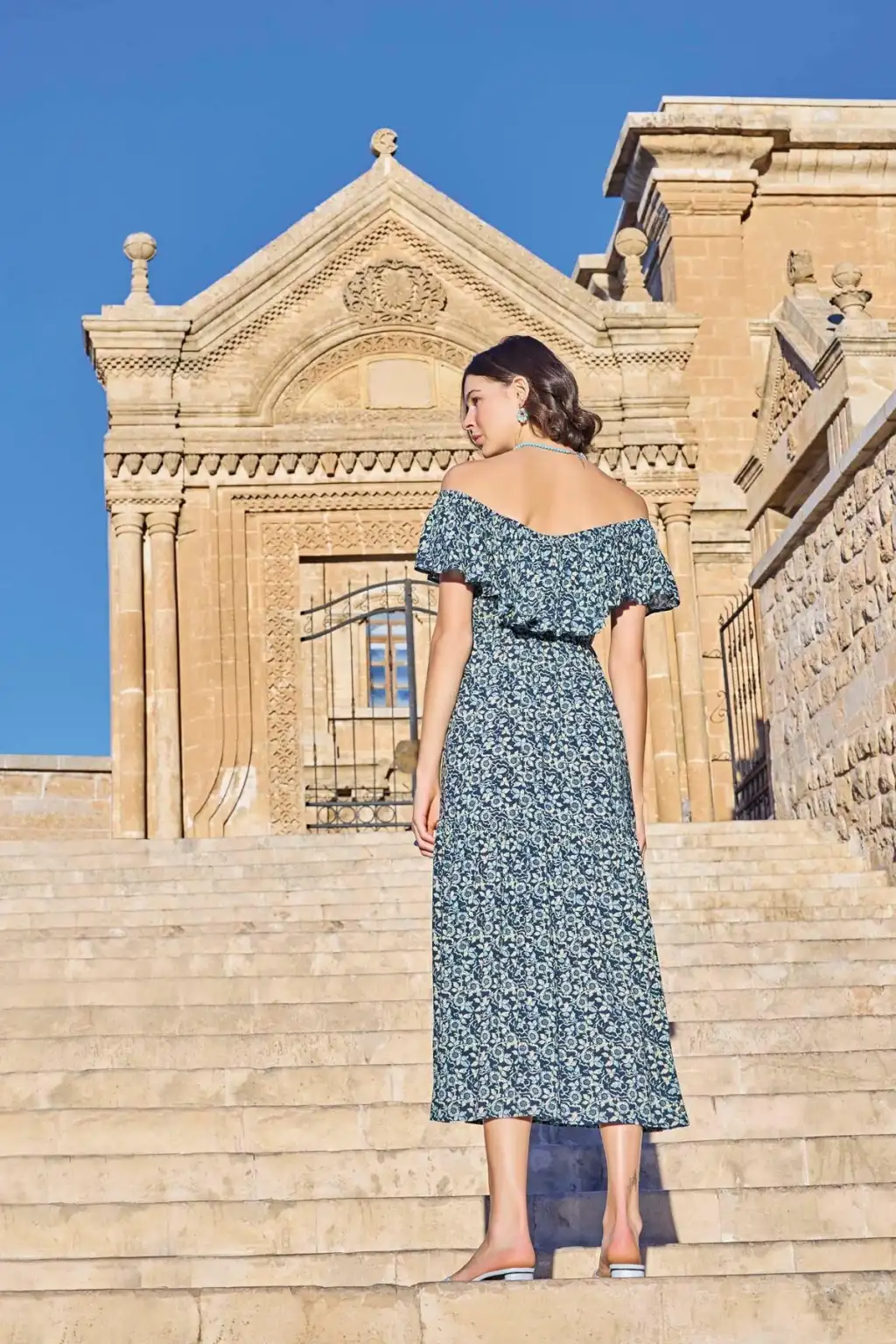 Elbise: Lacivert zemin üzerine çiçek desenlidir, kayık yakalıdır, dokuma kumaştır.