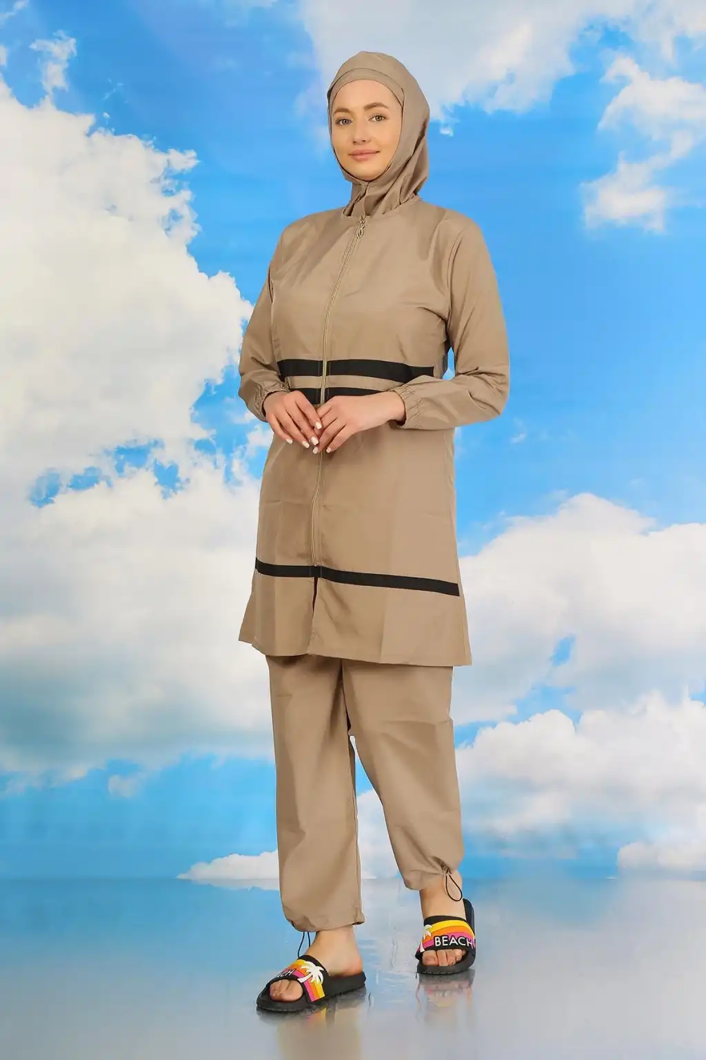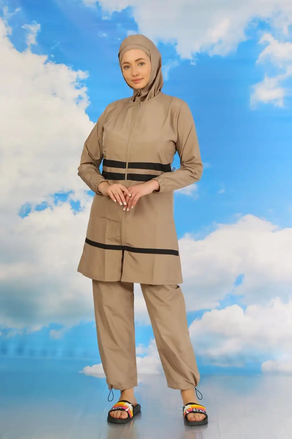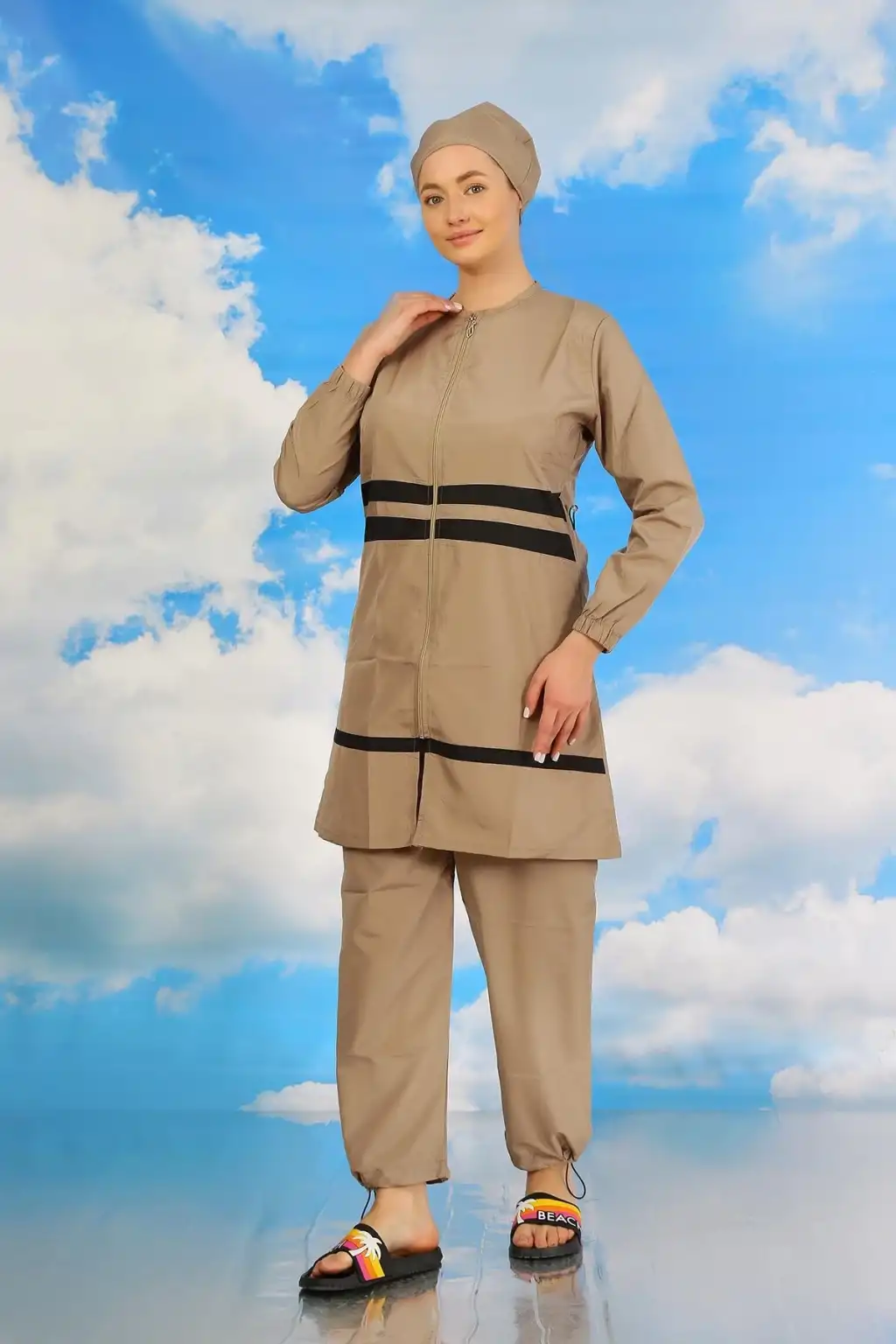 Çamaşır Kenti markasının özel tasarımı olan Kadın Tam Tesettür Mayo Bej ile plajda şıklık ve rahatlığı bir arada yaşayacaksınız.